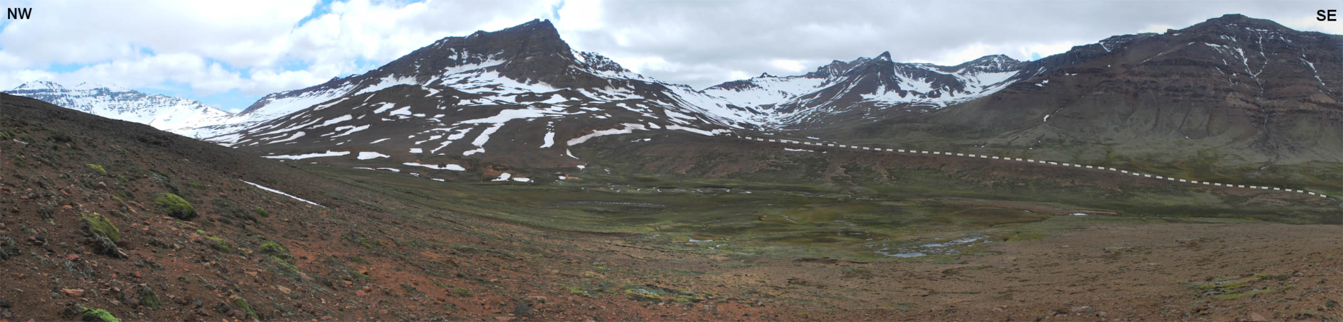 FIG. 3. Lateral moraine (dotted gray line) below the cirques shown in figure 2A (location in figure 1B).