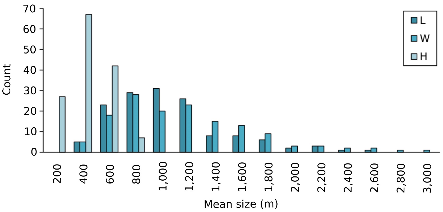 FIG. 8. Frequency distribution of L, W and H. Cirque mean surface (km2) decreases with an increasing in depth (H). Otherwise, when the average slope becomes gentle (i.e., decrease of H), cirques are most likely to grow longitudinally and laterally. As shown in figure 1, large cirques are concentrated along the eastern margin of the SPIF and gradually get smaller towards the interior of the continent around the SBMR.