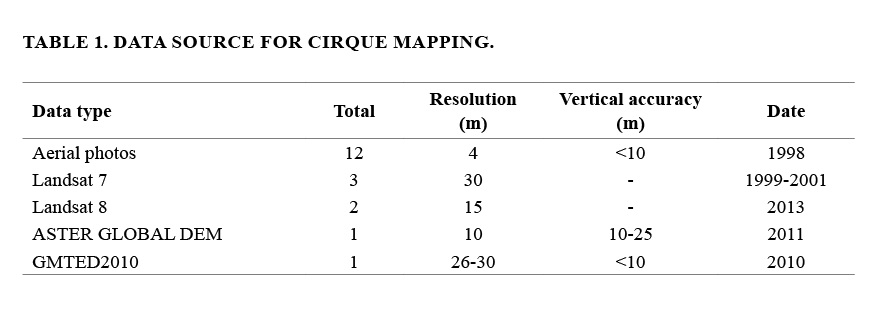 The interpretation of aerial photos, satellite imagery and field work allowed the identification of three cirque categories according to the presence/absence of snow or ice. These categories are distributed from the eastern margin of the SPIF, towards the interior of the continent to the easternmost section of the SBMR (Figs. 1, 2):