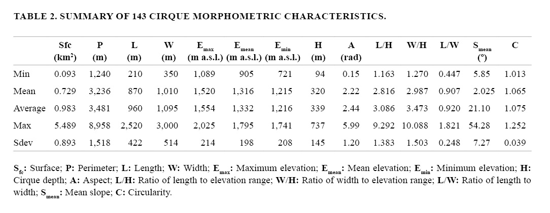 Following Delmas et al. (2013), morphometric variables were defined in such a way as to make them directly comparable with previous work on glacial cirques located in middle and high latitudes around the globe (Evans and Cox, 1974; Aniya and Welch, 1981; García-Ruiz et al., 2000; Federici and Spagnolo, 2004; Evans, 2006; Ruiz-Fernández et al., 2009; Mindrescu et al., 2010; Křížek and Milda, 2013; Delmás et al., 2013; Gómez-Villar et al., 2015). The variables considered are: surface (Sfc), perimeter (P), length (L), width (W), cirque depth (H), maximum elevation (Emax), mean elevation (Emean), minimum elevation (Emin), aspect (A), ratio of length to elevation range (L/H), ratio of width to elevation range (W/H), ratio of length to width (L/W), mean slope (Smean), and circularity (C).