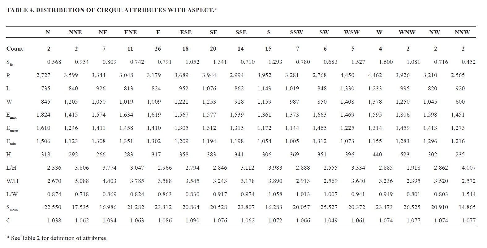 The highest L/H values are given by those cirques with NNW, NNE, NE, and S aspects. W/H values are higher in the NNE, ENE NE and S aspects. Considering this, cirques whose predominant aspect is NE, NNE and S, show broader cross section and deep incision (Table 4).
