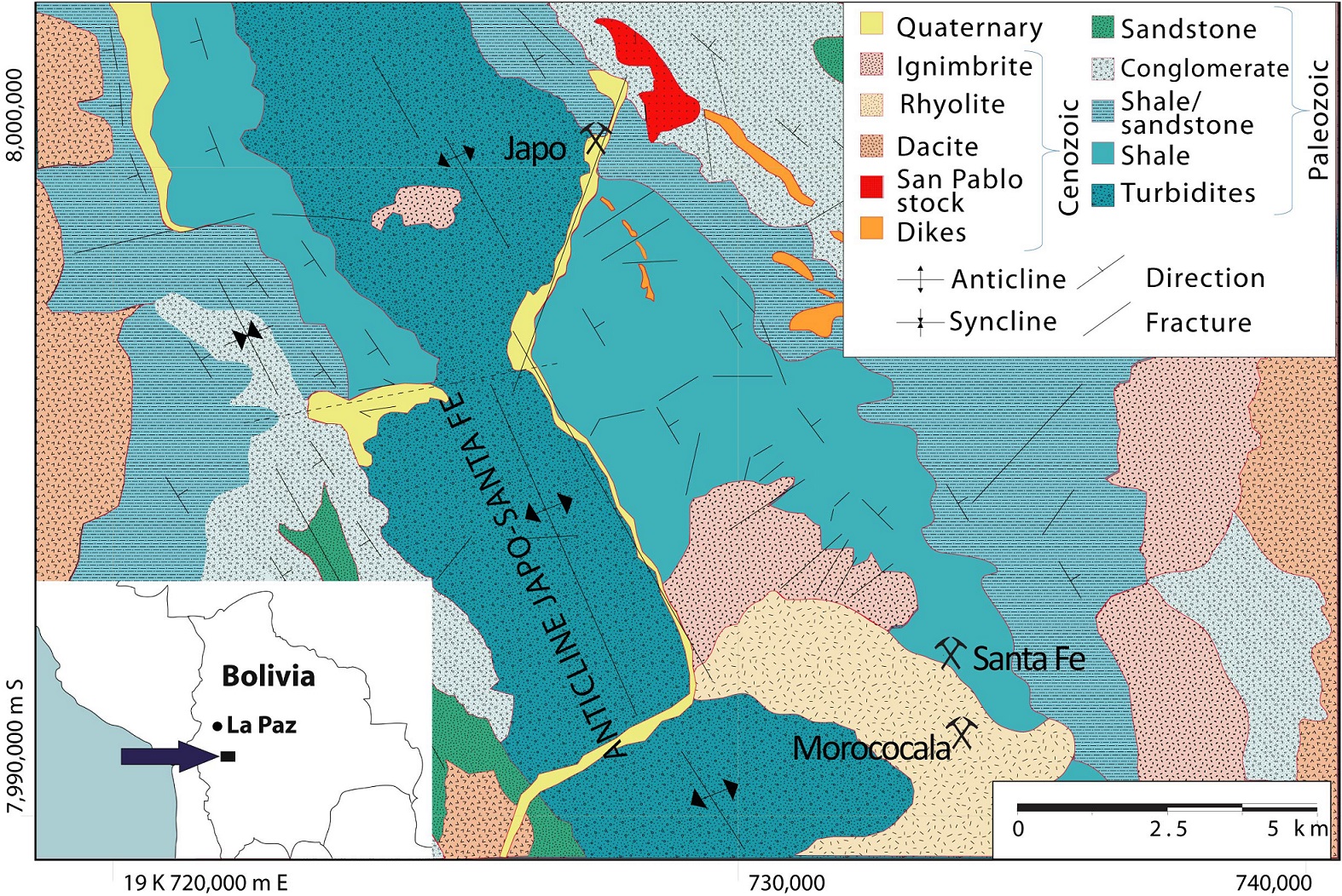 Despite the economic value and geopolitical importance of mineral resources in the Central Andes, most deposits there have been poorly studied, especially from the mineralogical and metallogenic points of view. Based on changes in the character of the mineral deposits, were described the main metallogenic provinces in the Altiplano, dividing the Central Andean tin belt in Northern and Southern parts; also different metallogenic ages to each of them were defined for the first time (Ahlfeld, 1967). The northern part contain Au, W, Sb, Sn, Bi, Zn, Pb deposits. Meanwhile, in the Southern part Ag is also present. The first publication from the SFD ore deposits includes a mineralogical and fluid inclusion characterization of many Sn and W deposits along the eastern Bolivian Andean Belt (Kelly and Turneaure, 1970). This study suggests that all the deposits in the Central Andean tin belt are due to a single but temporary extensive event of mineralization. Sugaki et al. (1988) contributed with new information from fluid inclusions in many ore deposits. They proposed that changes of temperature and salinity correspond with a zonal arrangement of minerals observed in many polymetallic deposits in Bolivia. Meanwhile, Sillitoe et al. (1975) proposed that most Sn deposits in Bolivia belong to the porphyry tin type; they included the San Pablo stock and the Japo mine as part of their study. Sugaki et al. (1981) carried out a geological study on hydrothermal deposits in the Oruro department. These authors proposed a genetic link between the Santa Fe, Morococala and Japo deposits. They described a Sn-Zn-Pb-Ag metallogenic association and reported the largest geological structures of the area (Sugaki et al., 1981; Sugaki et al., 2003). More recently, several studies have been done in the Central Andean tin belt focusing on the potential of its ore associations as a source of indium (Ishihara et al., 2011; Murakami and Ishihara, 2013).