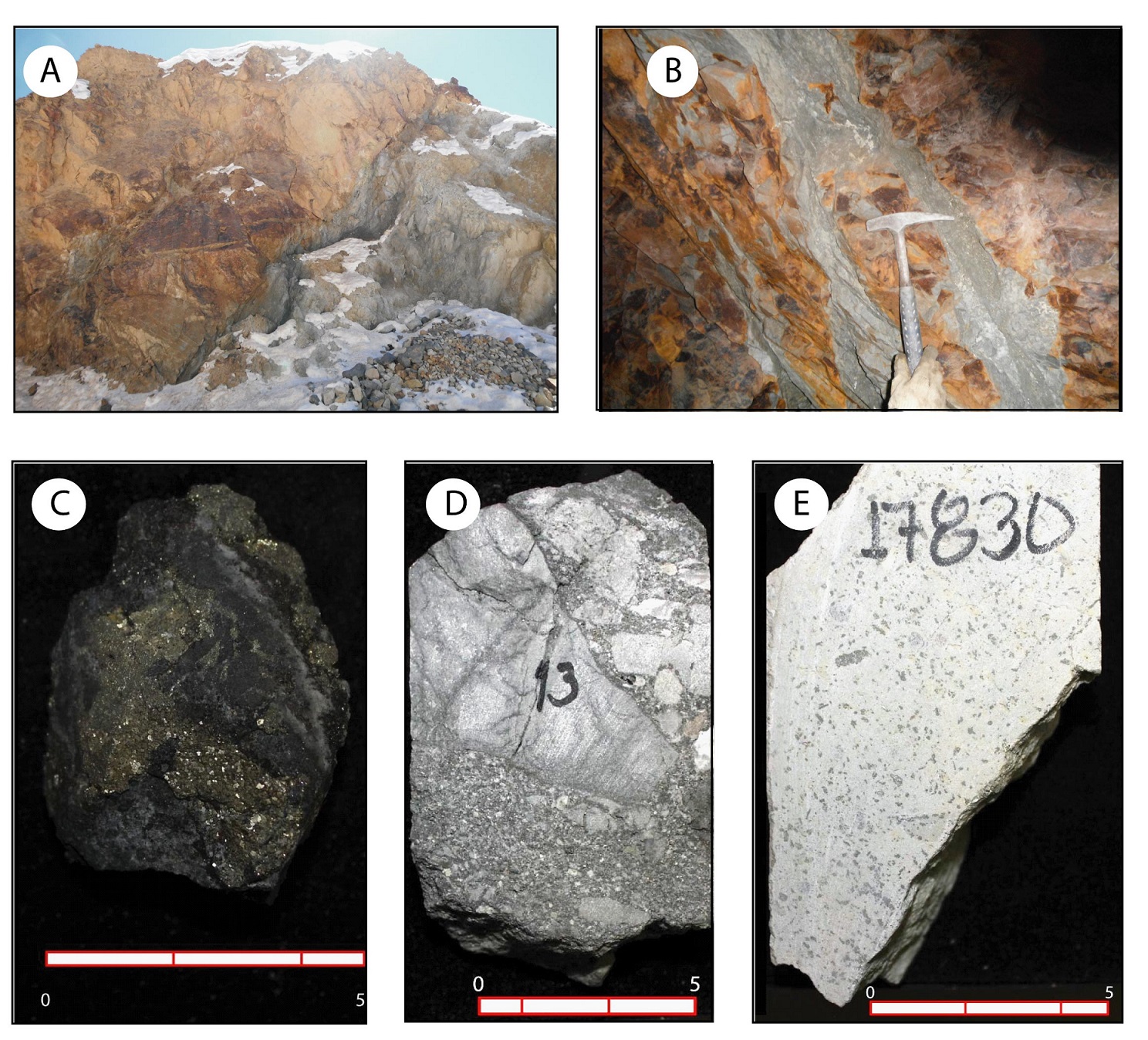 In the Japo deposit ore minerals occurr disseminated in intrusive rocks and also following lithological and structural contacts, fracture infillings and replacements (Figs. 3C, D, E). Hydrothermal alteration is developed (a) in plutonic rocks, where sericite, monazite, tourmaline and sulfides (mostly pyrite) were formed; and (b) along the contact between host rocks and quartz veins, where alunite, plumbojarosite, vermiculite, kaolinite and dickite occur.