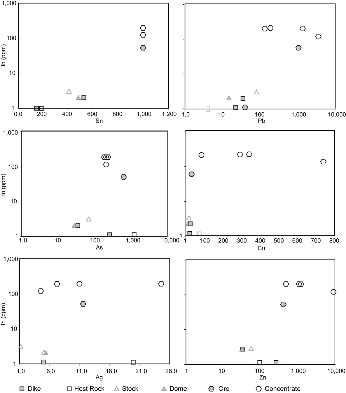 Fig. 4. Binary diagrams of Sn, Pb, As, Cu, Ag and Zn versus In in the igneous rock from the Santa Fe District, Bolivia.