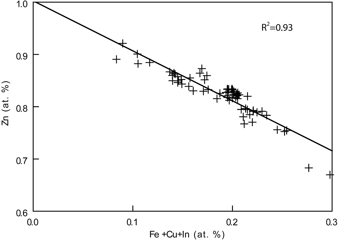 Sphalerite is the second ore mineral in abundance in the SFD, and occurs through all the mineralized zones. It develops anhedral grains, up to few cm across, with curvilinear equilibrium grain boundaries, forming mosaic aggregates and intergrowths with galena, pyrrhotite, pyrite and chalcopyrite (Figs. 5C, 5D). EPMA analyses of sphalerite reveal In contents, up to 0.26 wt% (Table 2), Cd up to 0.39 wt% and Pb up to 0.29 wt%. Sphalerite analyses show a high inverse correlation (r2=0.93) between Fe+Cu+In and Zn (Fig. 7).