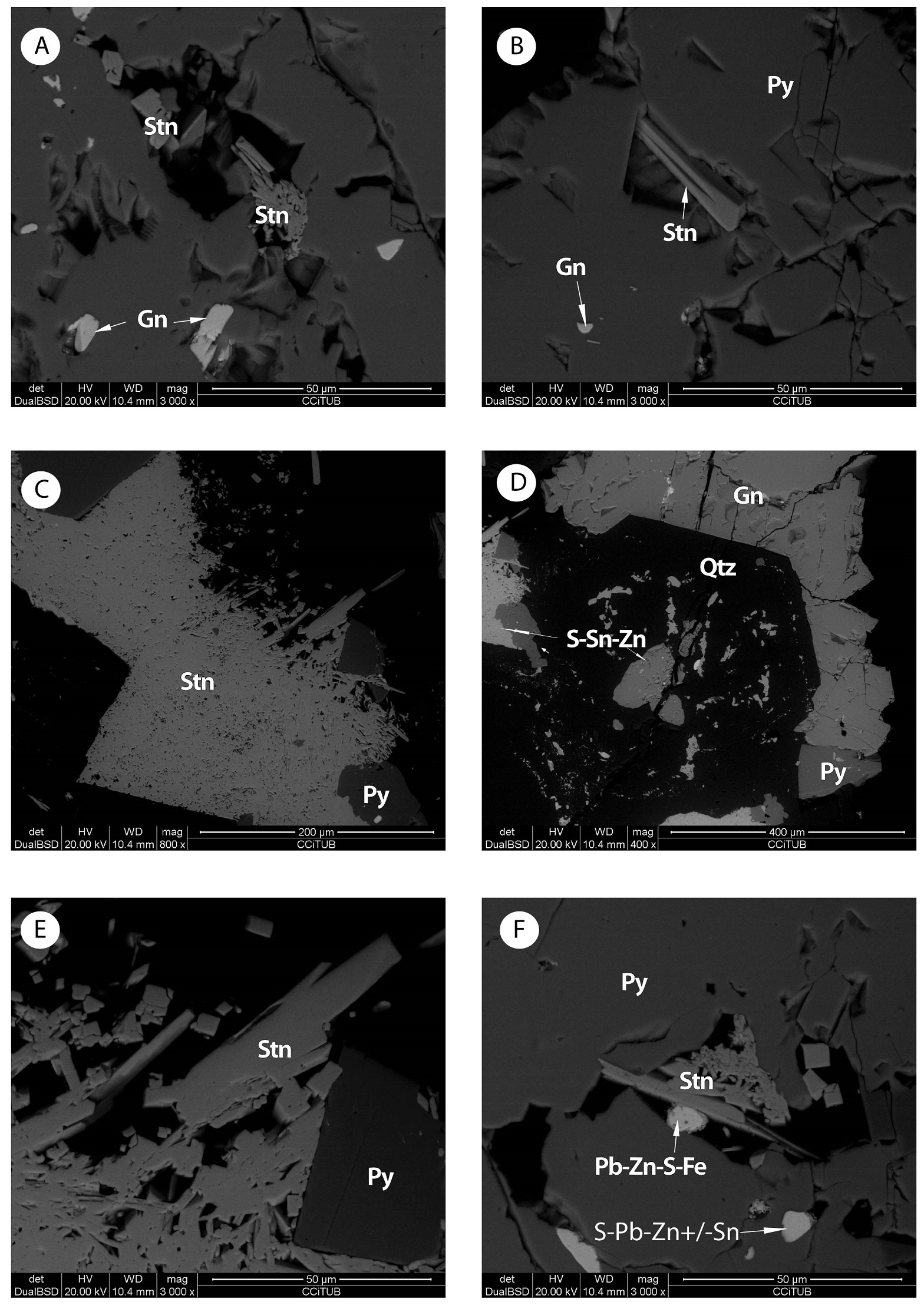 According with field and petrographic observations, two stages of mineralization can be distinguished in the SFD: (1) Early, Sn-rich mineralization, represented by cassiterite-quartz veins and disseminations (Figs. 5A and 5B), and (2) a late (more predominant), Zn-Pb-Ag mineralization, represented by veinlets with sphalerite, galena and stannite group phases (Figs. 5C and 5D). The former stage is more evident in the Japo deposit, while in Santa Fe and Morococala different generations of Sn and Zn-Pb-Ag mineralization are found.