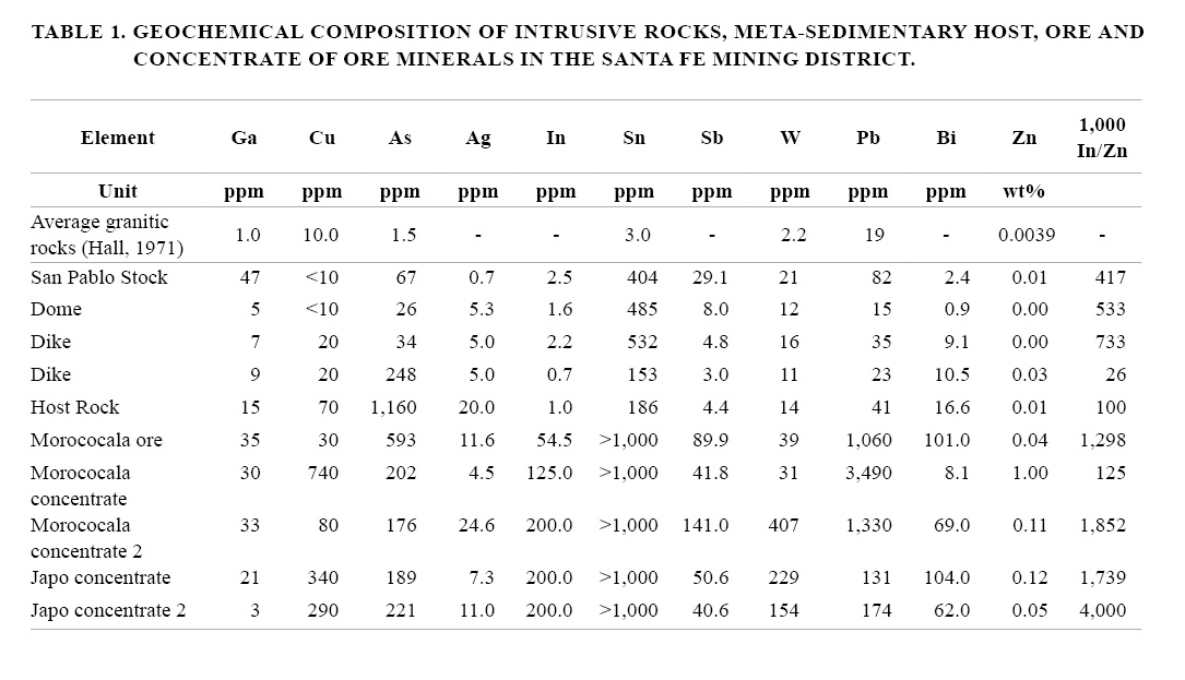 Metal and metalloid contents of the San Pablo quartz-latite stock and related dikes, as well as of the extrusive rocks and ore minerals of the SFD, are provided in table 1 and plotted in binary diagrams in figure 4. The San Pablo stock is anomalously rich in Sn, Ga, As, Cu, Ag, Zn, W and Pb all, relative to the average granitic rock (Turekian and Wedepohl, 1961; Hall, 1971). In the San Pablo stock, Sn and In contents are 404 ppm and 2.5 ppm, respectively. In the ore concentrate, indium attains up to 200 ppm and Sn exceeds 1,000 ppm.