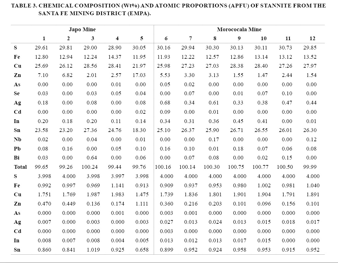 In the earliest stage of mineralization, cassiterite occurs in association with quartz, pyrite, arsenopyrite, chalcopyrite, chalcocite and, occasionally, galena and stannite. Cassiterite crystals are irregular in shape; in Santa Fe and Morococala they are smaller (~10 µm) than in Japo, where crystals up to few millimeters were found. Cassiterite has high iron contents, up to 3.23 wt% and the In content is between 0.09 and 0.25 wt%, whereas Ti, Nb, Ta and W contents are negligible.
