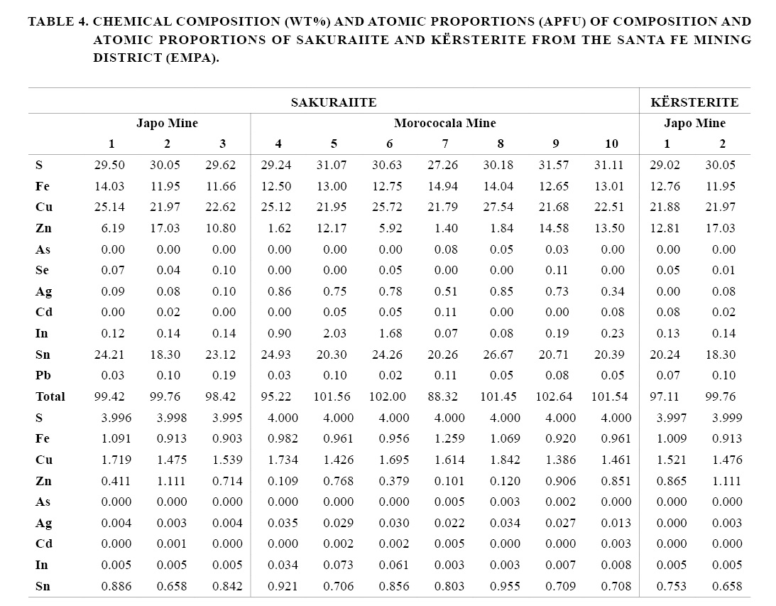 Stannite group has several members; some of them are currently cause of controversy. As mentioned above, stannite is conventionally used for Fe>Zn phases, and kësterite for Zn>Fe, accepting substitutions of [(Zn,Fe)In] for Cu-Sn. However, the most common substitution of Sn for In is seen in sakuraiite (Shimizu et al., 1986). Figure 11A illustrates these compositional variations of stannite group and their relationship with sulfosalts. Sakuraiite analysis can be interpreted as solid solutions along the stannite and kësterite continuous compositional series. The SEM-EDS and microprobe results in this study show that sakuraiite is formed as tetrahedral crystals with a general structural formula as [(Cu,Zn,Fe)3(Sn,In,)S4], which is consistent to Shimizu et al. (1986). Sakuraiite has up to 2.03 wt% of In (Figs. 8F, 11B; Tables 4, 5).