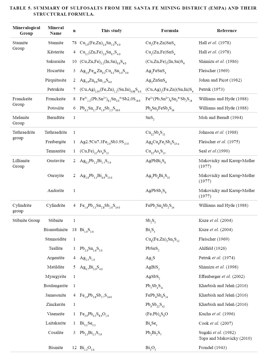 A thorough analysis of sulfosalt phases was carried on in the mineralization of the SFD. An outstanding variety of phases has been determined, and they were grouped according to the proportion of Sn, Pb, Ag, Cu, Sb and Bi (Table 5). Several solid solutions were established, as [Ag(Zn,Fe)Bi3S6], [Cu(Sn,Fe)2S4] and (PbBiAg).