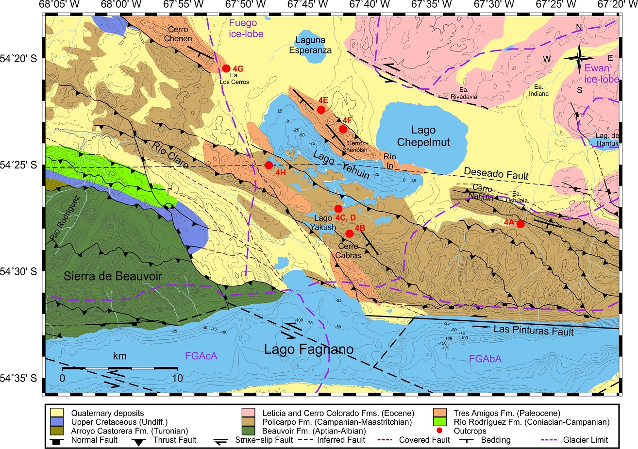 Fig. 2. Geologic map of the lago Yehuin area; location in figure 1. The elevations of the bottom of lago Yehuin (new acquired data) and lago Fagnano are displayed. Las Pinturas fault is part of the Magallanes-Fagnano Fault Zone. Adapted from Menichetti et al. (2008); Martinioni et al. (2013); Torres-Carbonell et al. (2013) and Esteban et al. (2014). The red dots show the position of studied outcrops, with the reference to the respective figures. The purple dashed line encloses the area of Fagnano Glacier, Fuego and Ewan glacier lobes after Coronato et al. (2009); FG AcA: Fagnano glacier accumulation area; FG AbA: Fagnano glacier ablation area.