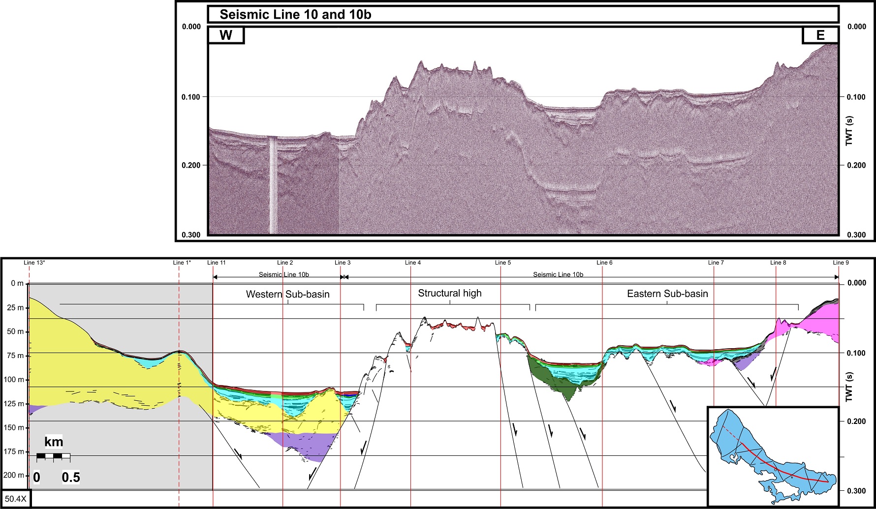 Fig. 6. Above, uninterpreted NW-SE high resolution single-channel seismic profiles 10 and 10b. Below, interpreted sketch; depth is given both in seconds of two-way traveltime (TWT) and converted to sub-lake level depth (m) based on a P-wave velocity of 1,430 m/s for water and 1,600 m/s for the sedimentary section. Vertical exaggeration is shown in the lower left side of the interpreted section. Vertical dashed red lines indicate crossing seismic profiles (location shown in figure 5). The black lines are interpreted normal faults. The western sector, grey shadowed, is a composite section resulting from interpolating seismic lines 11, 12 and 13 and using the bathymetric map. The sketch displays the distribution, geometry and internal seismic reflectors pattern of the ten recognized seismic facies within the entire Lago Yehuin basin. The seismic facies (SF) are displayed in different colors: purple for SF I; yellow for SF II; brown for SF III; dark green for SF IV; magenta for SF V; gray for SF VI; cyan for SF VII; green for SF VIII; red for SF IX; the acoustic basement is in white color.