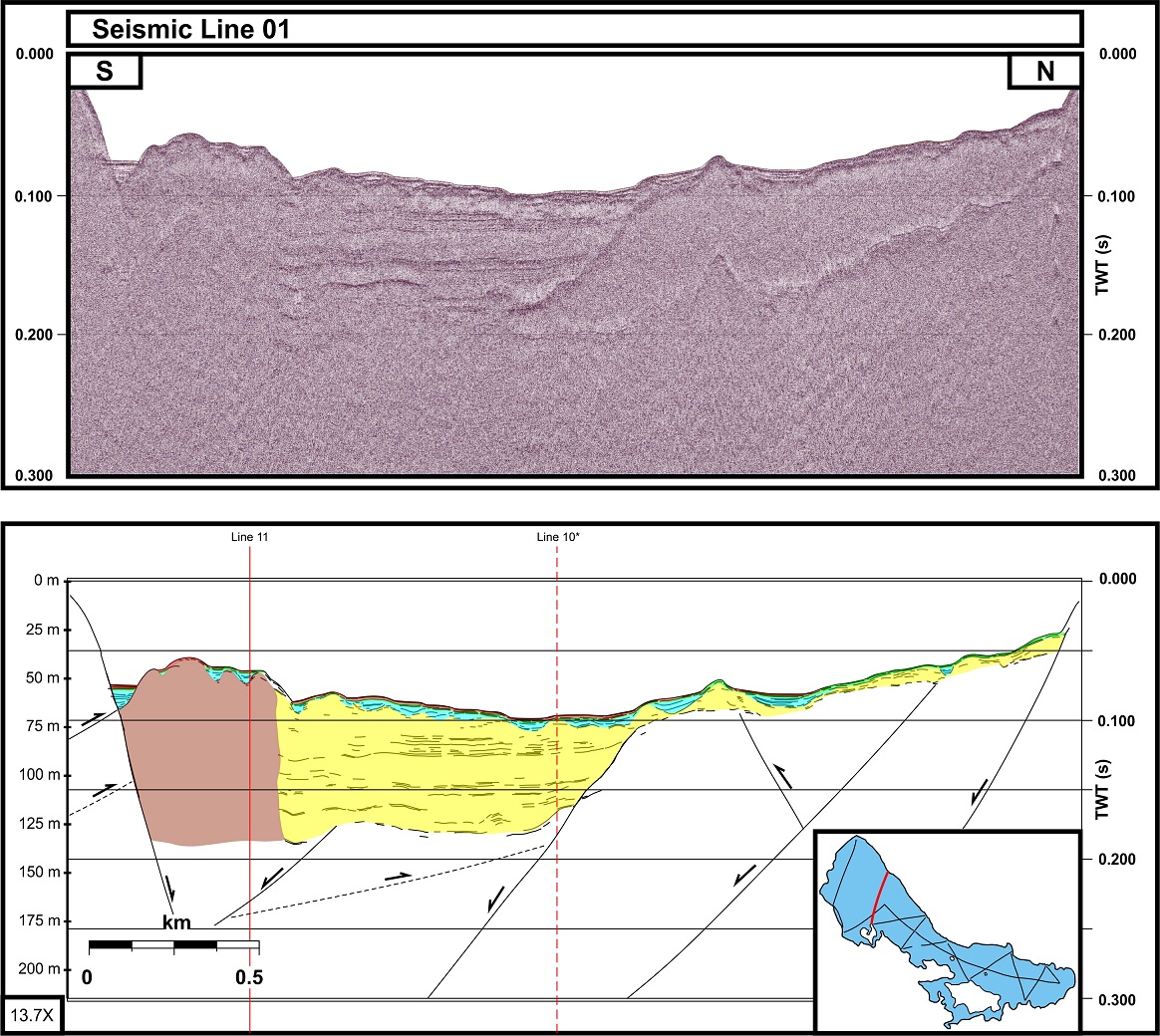 Fig. 7. Above, uninterpreted N-S high-resolution single-channel seismic line 01, located in the Western sub-basin. Below, interpreted sketch of the section; depth is given both in seconds of two-way traveltime (TWT) and converted to sub-lake level depth (m). Color code of seismic facies is the same as in figure 6. An irregular topography is observed. Vertical exaggeration is shown in the lower left side of the interpreted section. Vertical red lines indicate crossing seismic profiles 10* (dashed) and 11 (solid); locations are shown in figure 5. The acoustic basement hosts a large depocenter in the central zone. Two sets of faults were recognized: older thrust faults overprinted by normal faults displaying an upward branching pattern. SF III (brown) presents a chaotic seismic pattern and it is founded in a marginal location; SF III, with layered fabric, is located at the north of SF II (yellow). SF VII, SF VIII, SF IX are located over these glacigenic deposits (seismic unit IU).
