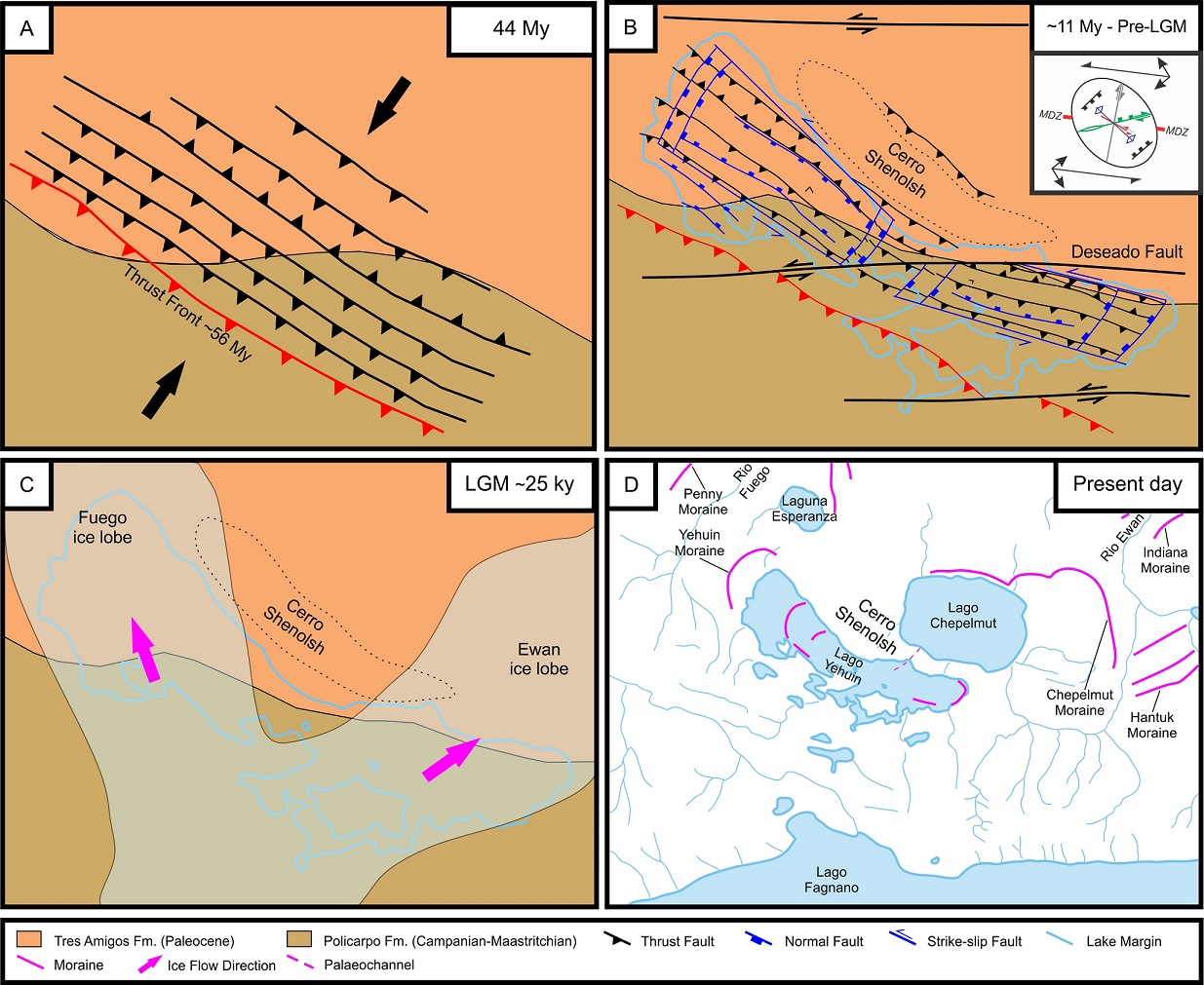 It has been long recognized that glaciers exploit previous structures as natural channels for ice flow; in particular recent studies highlighted the close relationship between the structures related to wrench kinematics in the southern Andes and fjords orientation (Glasser and Ghiglione, 2009 and references therein; Breuer et al., 2013), i.e., Fagnano, Beagle Channel glaciers are examples of the structural control exerted on overall glacier discharge patterns (Bujaleski, 2011; Lodolo et al., 2002, 2003). The general trend of Fuego and Ewan glaciers strongly reflects this structural control on glacial erosion; in this case the general orientation of the northern diffluent lobes of the Fagnano paleoglacier would have been governed by structures of the same strike as the Jurassic transfer faults (Fig. 12) that could have been reactivated during strike-slip tectonics. Moreover, the obstacle represented by Cerro Shenolsh and its southern prosecution, i.e., the internal barrier within the LY (Fig. 12B-B᾽, C-C᾽), caused the separation of the northern diffluent of Fagnano glacier in two ice lobes, Fuego and Ewan. The Yehuin sub-basins, in turn, acted as transverse depressions in the glacier route, both during advance and retreat stages forcing a sharp bend in the ice path. Therefore, the location of glacier deposits during the recessing stages, in and around LY area, were strongly controlled by both the reactivation of ancient Jurassic transfer faults as well as by localized depressions related to strike-slip faults. During this stage the lake’s waters were emptied towards the Atlantic Ocean, as it is also recorded by fluvial outwash relics in the Ewan and Fuego rivers area (Coronato et al., 2005). After the glaciers retreated, the general sediment supply pattern inverted, establishing the present drainage pattern with the LY being part of the lago Fagnano watershed.