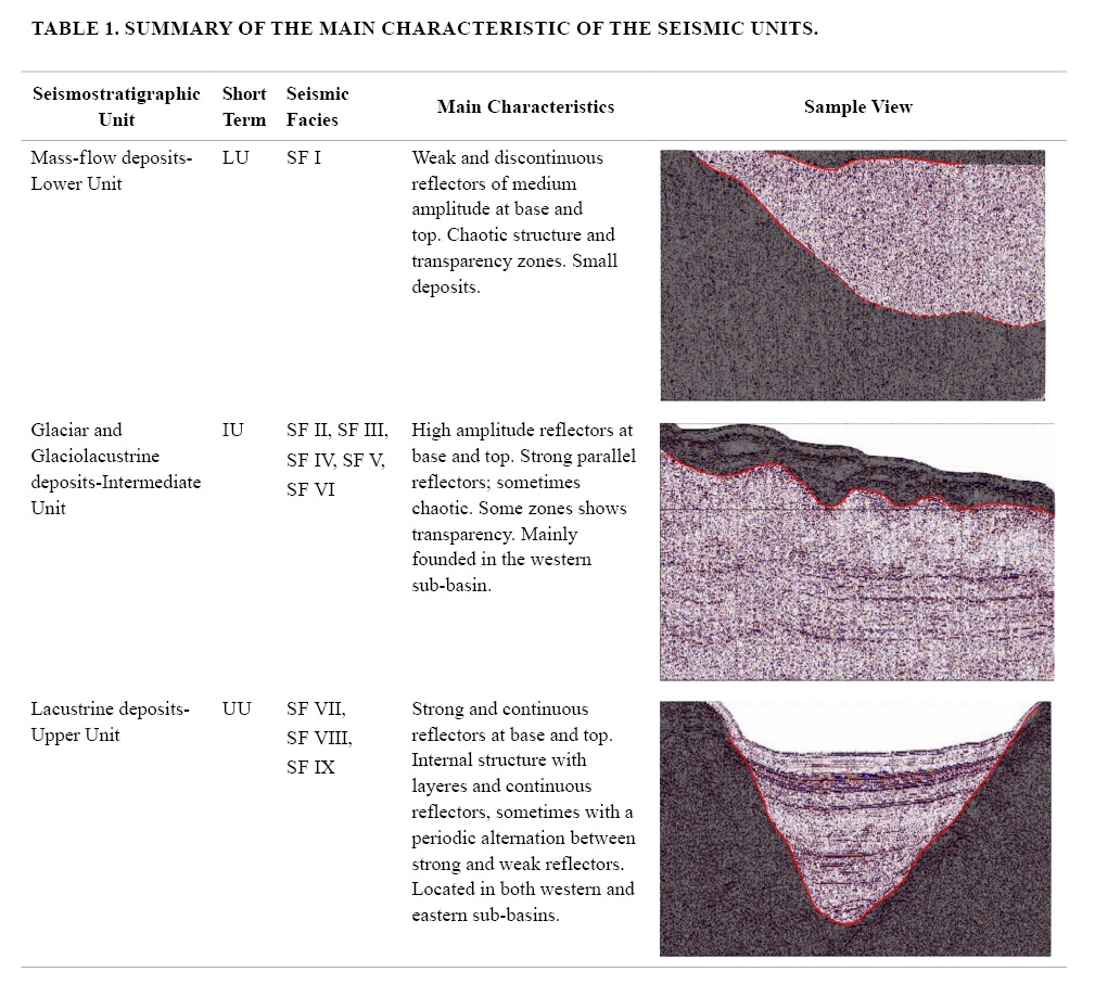 Three seismic units have been individuated in the seismic record acquired within LY (Table 1; see Pugin et al., 1999; Fernández et al., 2017). These units were defined as parts of the seismic sections based on their geometric patterns, architecture and stratigraphic relationships. Each seismic unit highlight a specific seismic facies (SF) which were identified based on concepts of depositional systems and seismic sequence stratigraphy (Mitchum et al., 1977; Table 2). The three seismic units are:
