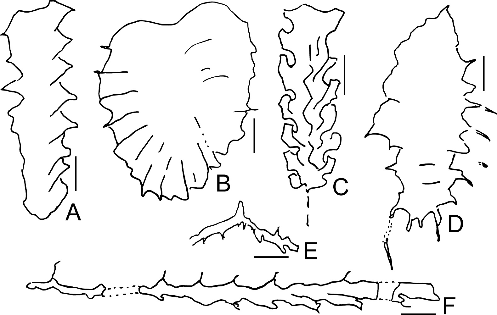 In addition, current field studies in the Rinconada Range yielded the graptolites Holmograptus spinosus Ruedemann, undetermined sinograptid stipes, Pseudophyllograptus sp., Bergstroemograptus crawfordi Harris, Cryptograptus schaeferi Lapworth, Glossograptus sp., Xiphograptus? sp. and Archiclimacograptus spp. (preliminary reported in Ortega et al., 2016; Fig. 4). The fauna comes from blocks of carbonate-cemented quartz-arenites (Figs. 1B, 2D), being indicative of the middle Darriwilian H. spinosus Zone of North America, Australasia, and equivalent levels from the Scandinavia and China (Maletz, 2009).
