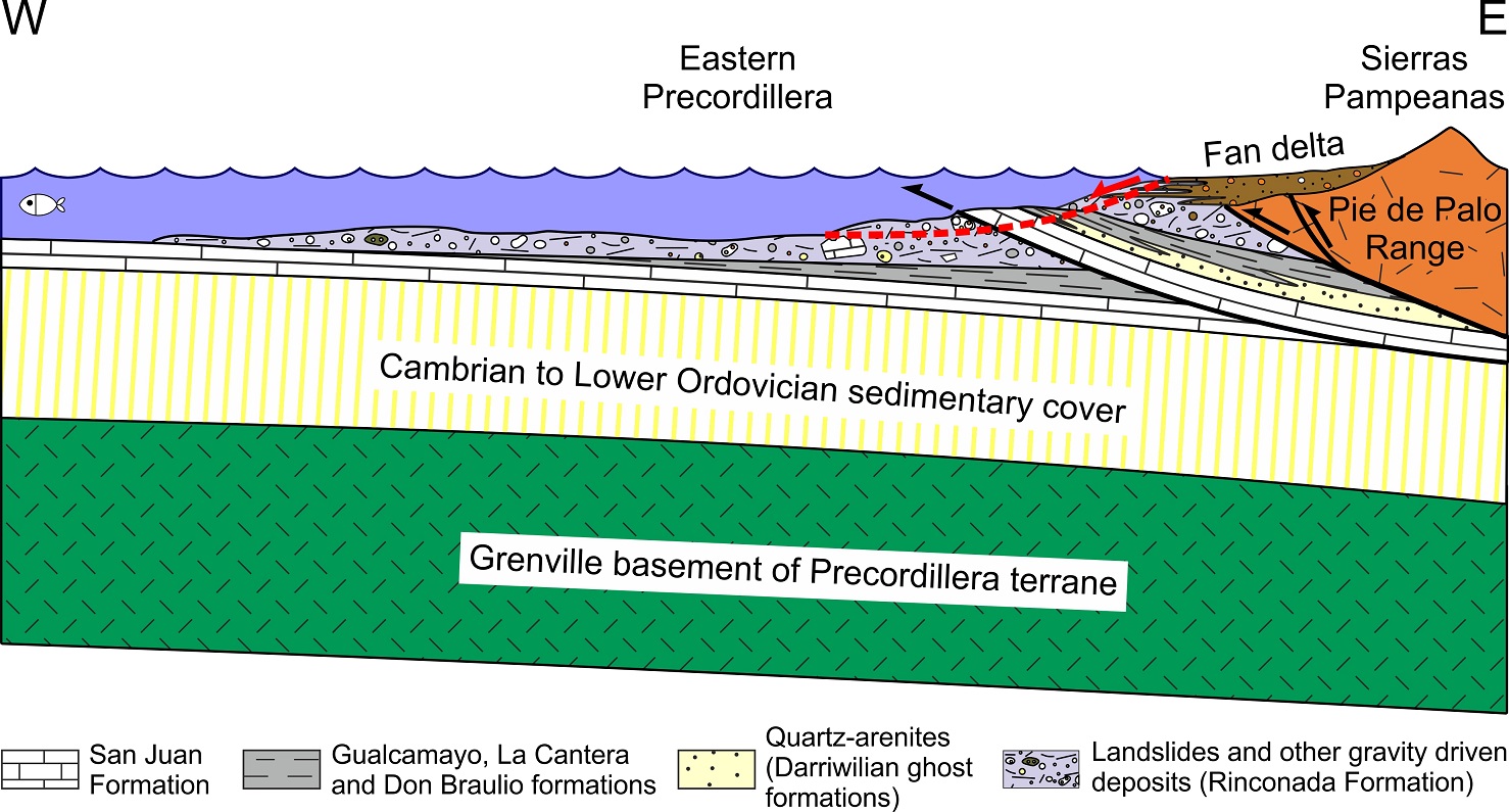 In a more plausible explanation, we envisage that the large carbonate blocks along with their sedimentary cover slid from an eastern orogenic front into the basin floor (Fig. 5). Accordingly, the middle Darriwilian quartz-arenite blocks of the Rinconada mélange would represent part of the synorogenic clastic wedge that was generated during the accretion of the Precordillera to Gondwana (Astini et al., 1995; Thomas et al., 2015). In addition, the Holmograptus spinosus Zone (sample RIN16) has been recorded in calcareous nodules from the top of the Gualcamayo Formation in the Villicum Range (Kaufmann and Ortega, 2016), but is absent in the Central Precordillera due to a hiatus (Ortega et al., 2007). Instead, the synorogenic sedimentation is partially represented in the Villicum Range by the La Cantera Formation (late Darriwilian), which includes at its base clasts with fragments of Sacabambaspis janvieri. This early agnathan fish inhabited the shallow water continental margins of Gondwana, thus strengthening the palaeobiogeographic connection of the Precordillera with Gondwana by the late Darriwilian times (Albanesi et al., 1995).