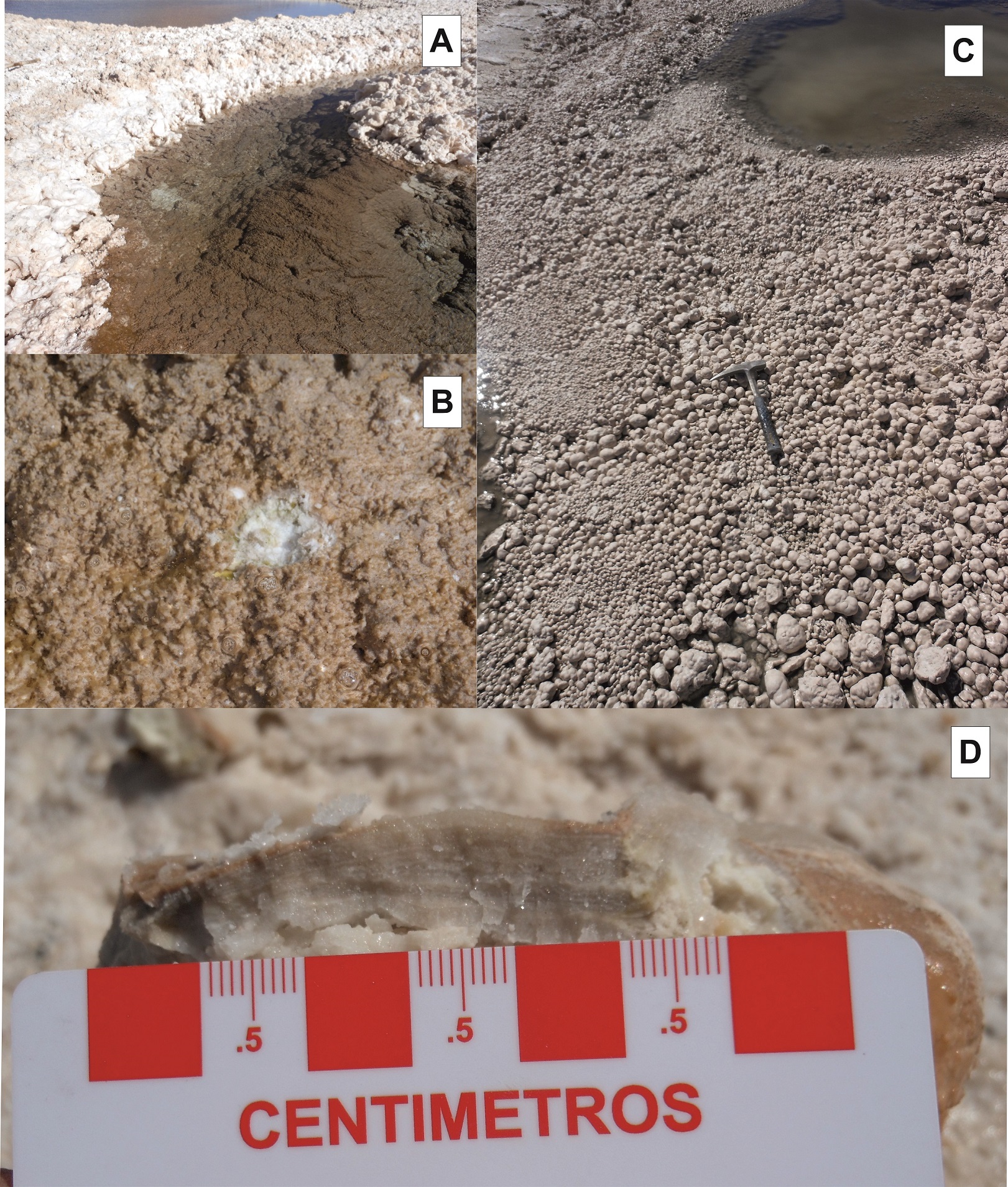 In regards to the organisms that form the organic mat, Demergasso et al. (2003), Azúa-Bustos et al. (2012) and, especially, Rasuk et al. (2014), suggest that similar mats are formed by Proteobacteria (Alpha and Gamma), Bacteroidetes and Planctomycetes, with a small contribution of Cyanobacterias. In some zones near these growth places, stromatolites have been formed displaying a clear microlayering (Fig. 3D). Additionally, in an area located to the southeast of Agua Amarga Salar, the organisms formed oncolites, several centimeters in diameter, which display a layering surrounding a nucleus (Fig. 3C).