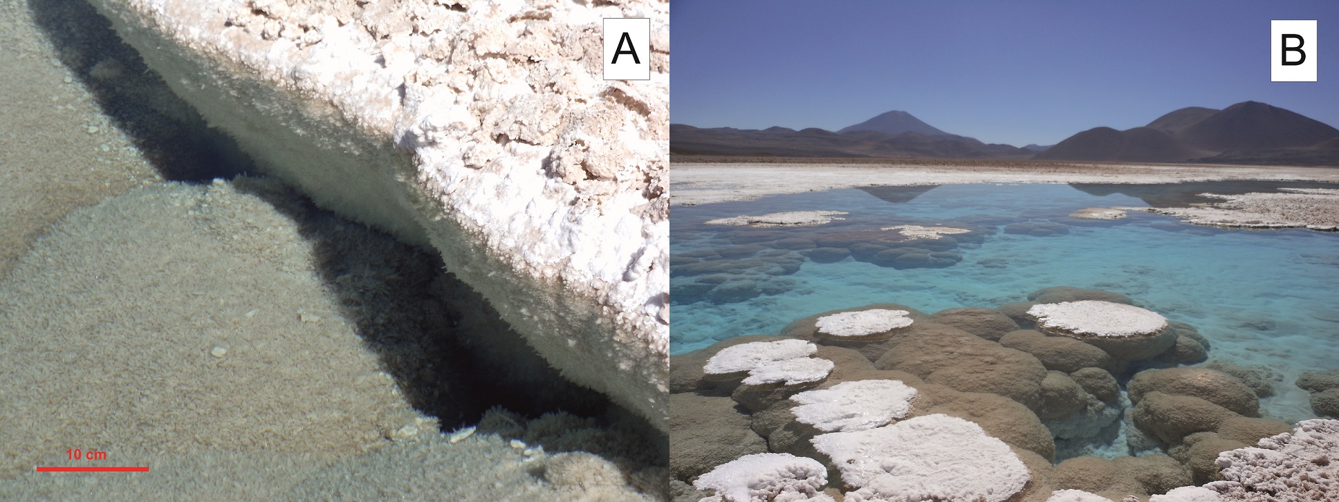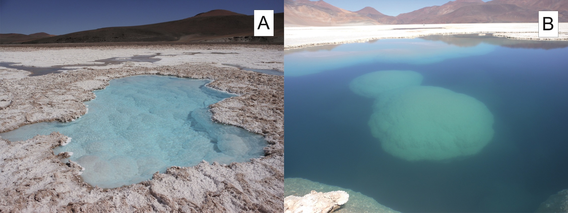 The organic mats and the initial stromatolitic formations have been observed in lagoons located in the Aguilar (Fig. 2E) Agua Amarga (Fig. 2B) salars.