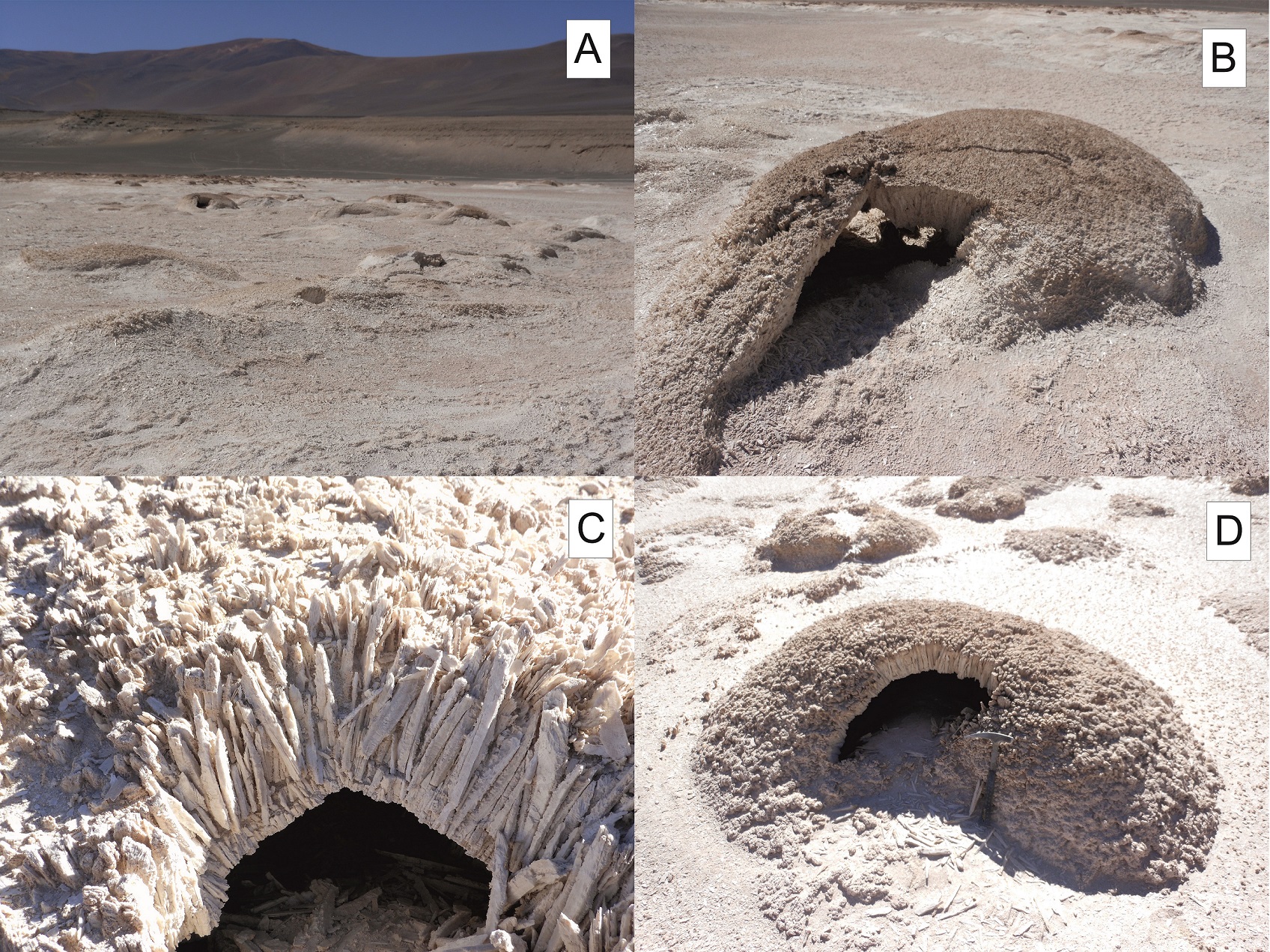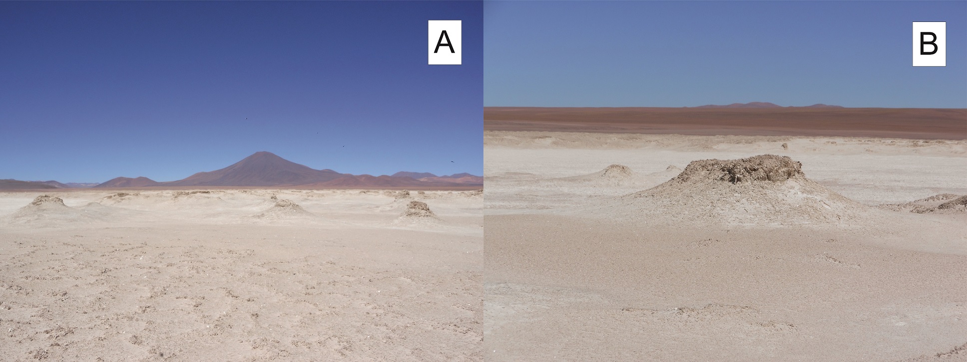 This stage has been observed in Agua Amarga Salar (Fig. 2B) and Aguilar Salar (Fig. 2E), through the domes still submerged in the lagoons, and in Agua Amarga Salar (Fig. 2B) and Pajonales Salar, by the structures emerged on the surface and surrounded by the saline crust.