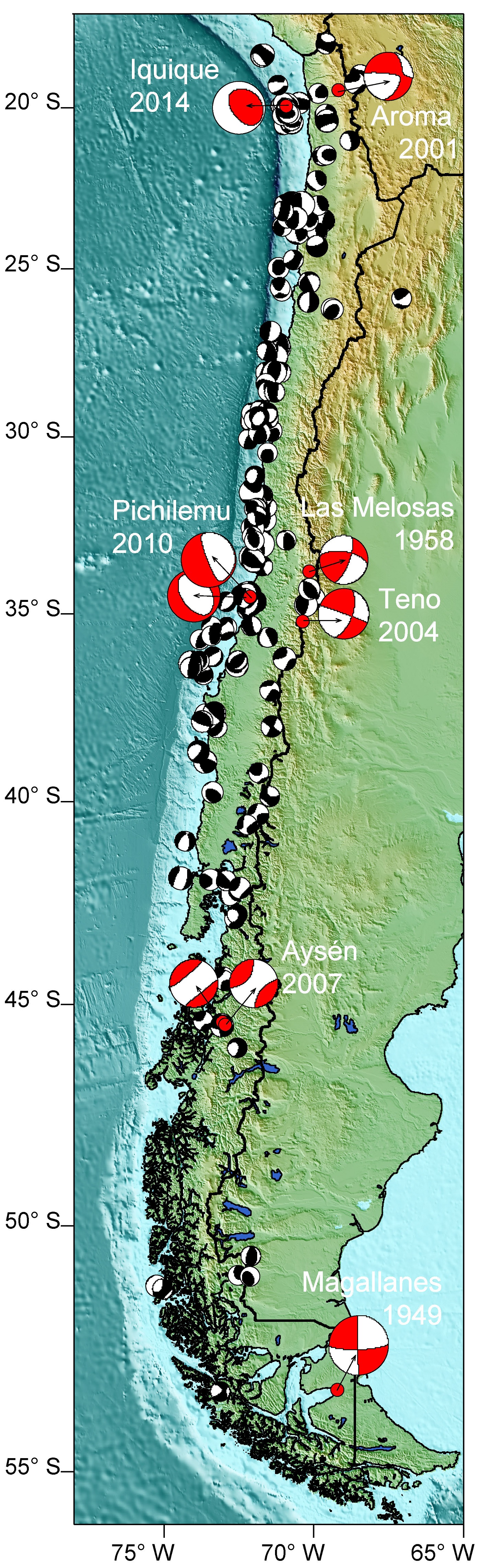 There are relatively few published studies documenting crustal earthquakes in Chile (e.g., Pardo et al., 2002; Barrientos et al., 2004). In recent years, the Pichilemu Mw 7.0 earthquake (which struck 12 days after the 2010 Maule interplate mega-earthquake) and the Pisagua Mw 6.7 earthquake (16 days before the 2014 Iquique interplate earthquake) have attracted the attention of geologists and seismologists. These events motivated several studies regarding the nature of these events and their tectonic significance in the subduction cycle, due to their spatial proximity to the trench and the fact that they were temporally associated with Mw 8.8 and Mw 8.1 interplate earthquakes (e.g., Farías et al., 2011; Aron et al., 2014; González et al., 2015).