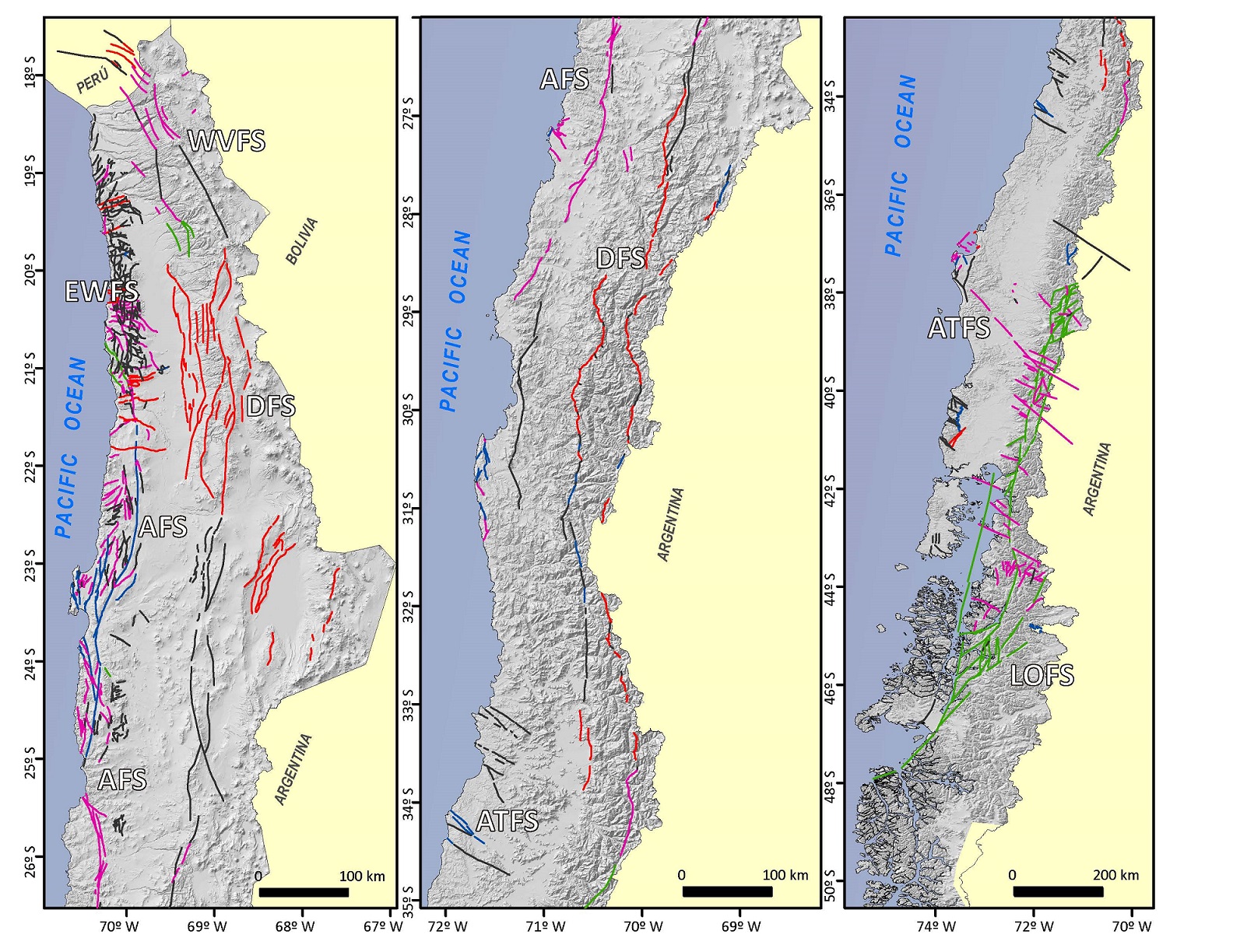The territory of Chile hosts several prominent crustal faults which have undergone neotectonic activity, and which are predominantly spatially and/or temporally associated with strike-slip fault systems formed by the strain partitioning since at least the middle Jurassic (Hoffmann-Rothe et al., 2006). In this work, we reassess and compile over 1,600 faults from existing publications (Fig. 3). The basis of our work included the compilations of Lavenu et al. (2000), Lavenu (2005), PMA (2009) and SARA (2016).