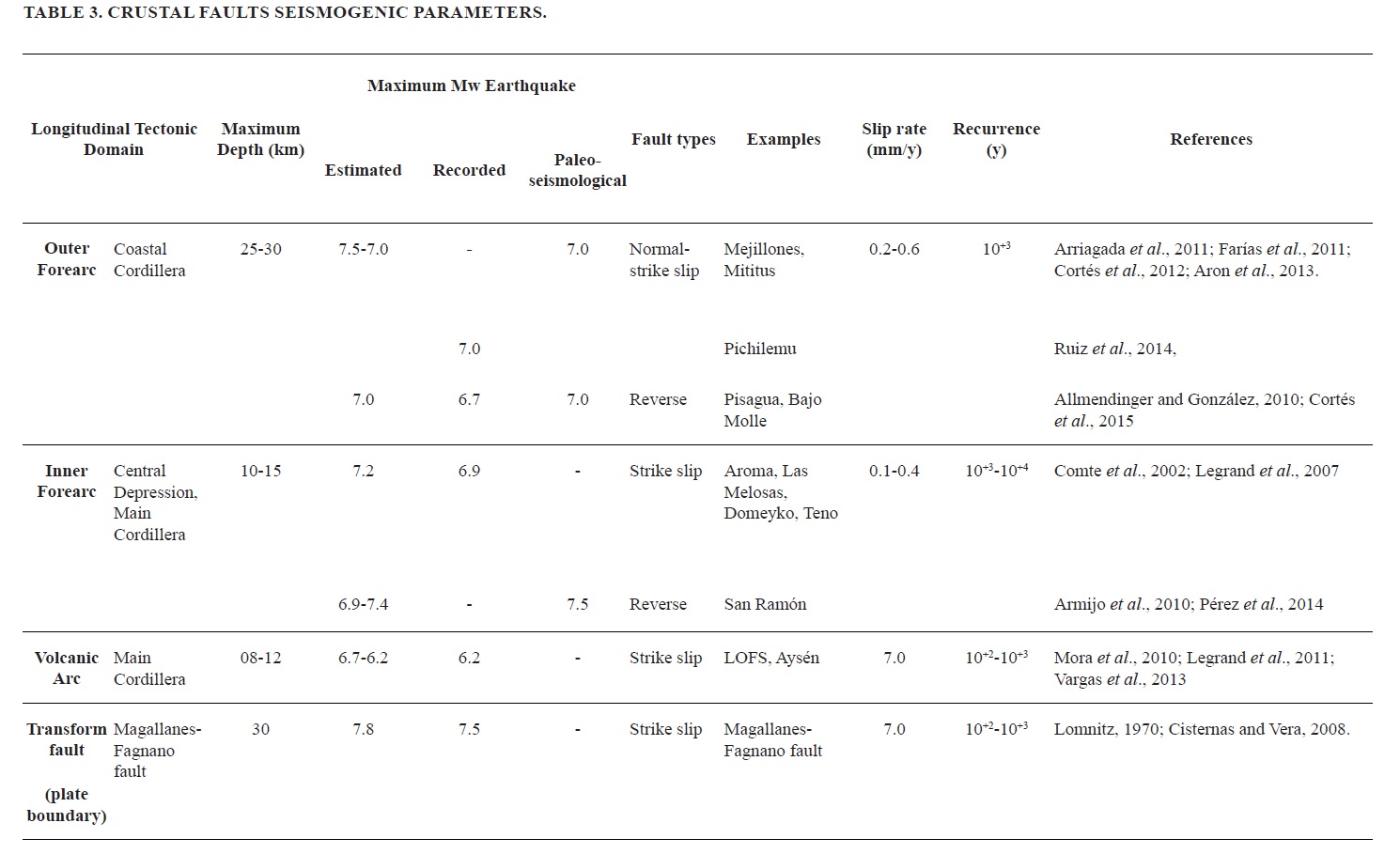 The available structural, paleoseismological and geodetic data, though limited, suggest that current slip rates of Chilean crustal faults range from 0.2 mm/yr in the fore-arc to up to 6.5 mm/yr in the intra-arc (e.g., Wang et al., 2007; Armijo et al., 2010; Cortés et al., 2012; Stanton-Yonge et al., 2016). This implies recurrence times of Mw>6 crustal fault earthquakes in the range of hundreds-to-tens of thousands of years (Sibson, 2002). The various modes of tectonic fault reactivation, and the wide range of slip rates that these faults exhibit, greatly complicate crustal seismic hazard assessment in Chile. Many faults which are considered active under the traditional classification (i.e., over the last 10,000 years, USGS, 2018b) may not be capable of generating significant earthquakes in thousands of years according to their recurrence time (Machette, 2000; Costa, 2004; Costa et al, 2006a), while faults of quaternary age or older, with no instrumentally recorded seismicity, may have the potential to trigger socially consequential earthquakes with Mw>7 (e.g., 2011 Mw 7.1 Darfield earthquake, New Zealand; Li et al., 2014).