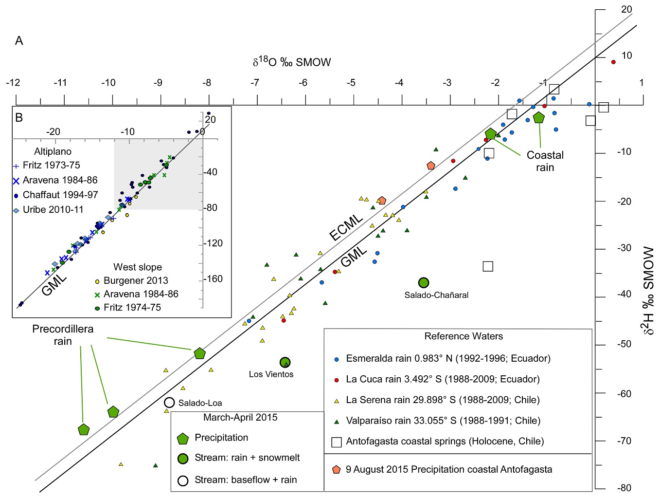 Fig. 3. Published data for δ18O and δ2H composition of precipitation along the Pacific coastline of South America, in the Atacama Desert and in the westernmost Central Andes, compared to the rain water of March 2015, stream water of March-April 2015, and rain water of 9 August 2015. Shown as lines are the Global Mean Water Line (δ2H=8δ18O+10) (GMWL) (Craig, 1961; Rozanski et al., 1993) and the Eastern Cordillera Mean Water Line (δ2H=8.4δ18O+15.9) (ECMWL), an example of eastern-sourced precipitation in a region immediately east of the study area (Fig. 2A box labeled “R”; Rohrmann et al. (2014)). A. Shown as circles and triangles are monthly means of Global Network of Isotopes in Precipitation (GNIP) data for Pacific coastal rains of equatorial and mid-latitude South America. Squares indicate the isotopic composition of water from springs whose recharge areas are the coastal mountains (Herrera and Custodio, 2014); B. Published northern Chilean summer season rain data for 19° to 30° S, distinguished by location on the western slope of the Andes or across an orographic divide in the western part of the internally-drained Altiplano plateau. Precipitation data correspond mostly to high elevation areas in climate zone I where mean annual precipitation exceeds 50 mm per year (Fig. 2B). The western slope data from Fritz et al. (1981) and Aravena et al. (1999) are for widely dispersed stations between 19-21° S at elevations spanning 2,380 m a.s.l. to 4,150 m a.s.l. These are summer season (November through April) amount-weighted averages for 1974 and 1975 (Fritz et al., 1981) and 1984, 1985 and 1986 (Aravena et al., 1999). The western slope data from Burgener et al. (2016) are for weighted averages of January 2013 precipitation for stations along an elevation profile (40-3,100 m a.s.l.) at 30° S. The Altiplano region data are from four sources. Amount-weighted averages for summer seasons of 1973, 1974 and 1975 are from Fritz et al. (1981) and for 1984, 1985 and 1986 from Aravena et al. (1999). Those sources report locations between 19-21° S at elevations between 3,720 m a.s.l. and 4,350 m a.s.l. Uribe et al. (2015) presented monthly amount-weighted averages for October 2010, March 2011, and November 2011 for three locations in the Salar de Huasco basin (~20.2° S, 68.8° W). Chaffaut (1998) presented monthly mean data for a single site at 23.36° S, 67.42° W, elevation 4,400 m a.s.l. corresponding to summer seasons (October through April) between October 1994 and February 1997. Box with gray background shows the range plotted in (A).