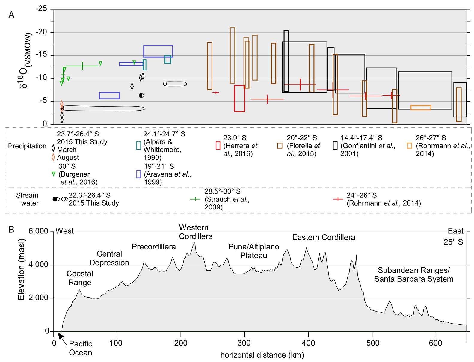 Fig. 4. A. Published δ18O of environmental waters for west-central South America and for the March 2015 event are compared to B topography at 25° S. Although Andean topography varies along the strike, there are fundamental topographic features that persist and that strongly influence the movement across the Andes of water vapor-bearing air parcels. A. the horizontal lengths of lines or boxes represent bins of sampled locations. Precipitation data from Herrera et al. (2016) (red box) and Alpers and Whittemore (1990) (greenish-blue boxes) and stream data from Rohrmann et al. (2014) (red lines) are located within or near 24°-26° S and are placed on the 25° S profile based strictly on elevation. For most data collected at greater distances from the 25° S profile, data were binned by altitude (usually 1,000 m) and positioned on the 25° S profile relative to topographic barriers encountered by air masses. Fiorella et al. (2015) data are shown as individual stations; light brown boxes correspond to sampling stations located north of 20° S, where the Altiplano plateau is much less arid than in comparable locations to the south. For all data except Burgener et al. (2016) the box height or vertical line height shows 1 standard deviation above and below the average. Burgener et al. (their table S1; 2016) (triangles) reported only amount-weighted means for precipitation during 2013 and 2014. For Gonfiantini et al. (2001) data, averages are for stations in two transects but standard deviation is for monthly data from a subset of the stations. Summer rain in the Puna plateau (red box) is anomalous to the trends on the east and west Andean flanks, possibly due to local water vapor sources, strong convection during precipitation, and below-cloud evaporation (Rohrmann et al., 2014).