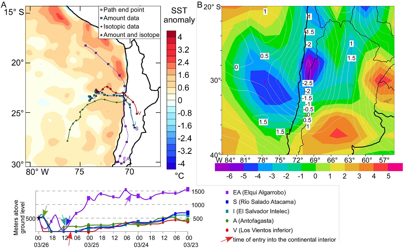 Fig. 5. A. Tracks of air parcels that arrived at five locations in the study area, and the average sea surface temperature anomalies for 23-24-25 March 2015, displayed in map (top) and cross sections (bottom). Air masses were tracked backward 72 hours prior to 0000 UTC 26 March (star) using HYSPLIT, from final locations located 500 m above ground surface. Progressive marks along tracks are 6-hour increments. The Sea Surface Temperature (SST) anomalies are from Bozkurt et al. (2016). End-point locations EA, I, and V have precipitation totals given in table 1. End-point locations S, A, V have precipitation isotopic data in table 2. While each air parcel was over the ocean, they share a common vertical position scale (lower plot), but once each parcel entered the continent (arrow) it crosses a unique topographic profile and its vertical position relative to the other parcels is not readily discernible in the cross sections; B. Vertical motion (white contours, microbars per second, negative values indicate upward movement) and anomalous vertical gradient of equivalent potential temperature (colors, degrees K per 100 mb) on the 600-mb pressure level at 1800 UTC 25 March 2015. The South American coastline and national borders are outlined in black.