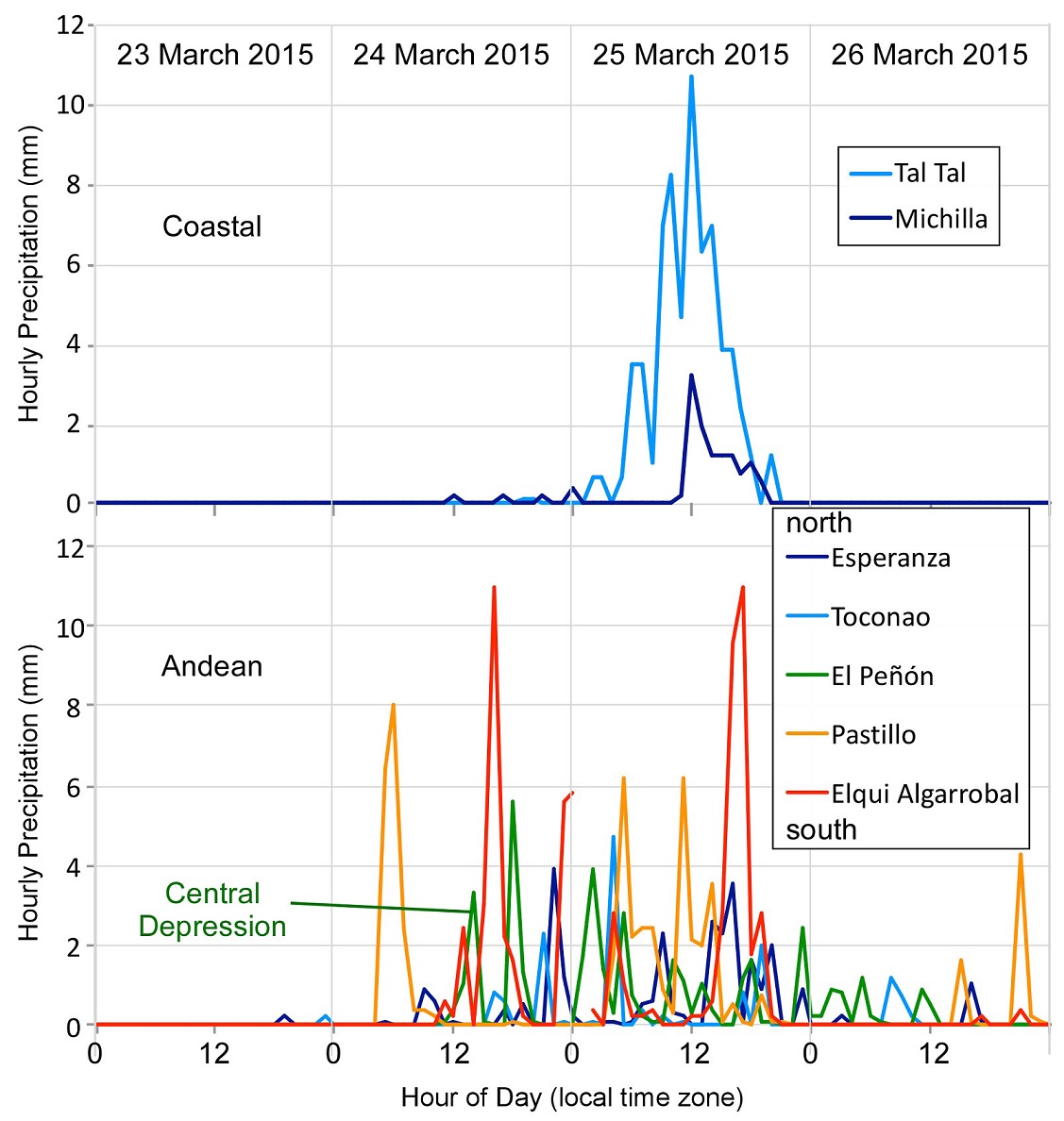 Fig. 6. Hourly precipitation amounts during 23-26 March 2015 for A. Coastal locations, and B. Interior locations. Appendix Table A1 lists sources for the hourly data, using sources with reliable dates. Michila and TalTal (Campbell) are located at 22 m a.s.l. and 37 m a.s.l., respectively. Elqui Algarrobal, Pastillo, El Peñón, Esperanza and Toconao are located at 760, 1,151, 1,840, 2,266, and 2,495 m a.s.l., respectively. With reference to the Chilean summer time zone (UTC-03 for March 2015), the majority of rain fell at coastal stations in the middle hours of 25 March. For most eastern stations significant rain began by mid-day 24 March and persisted through 26 March.