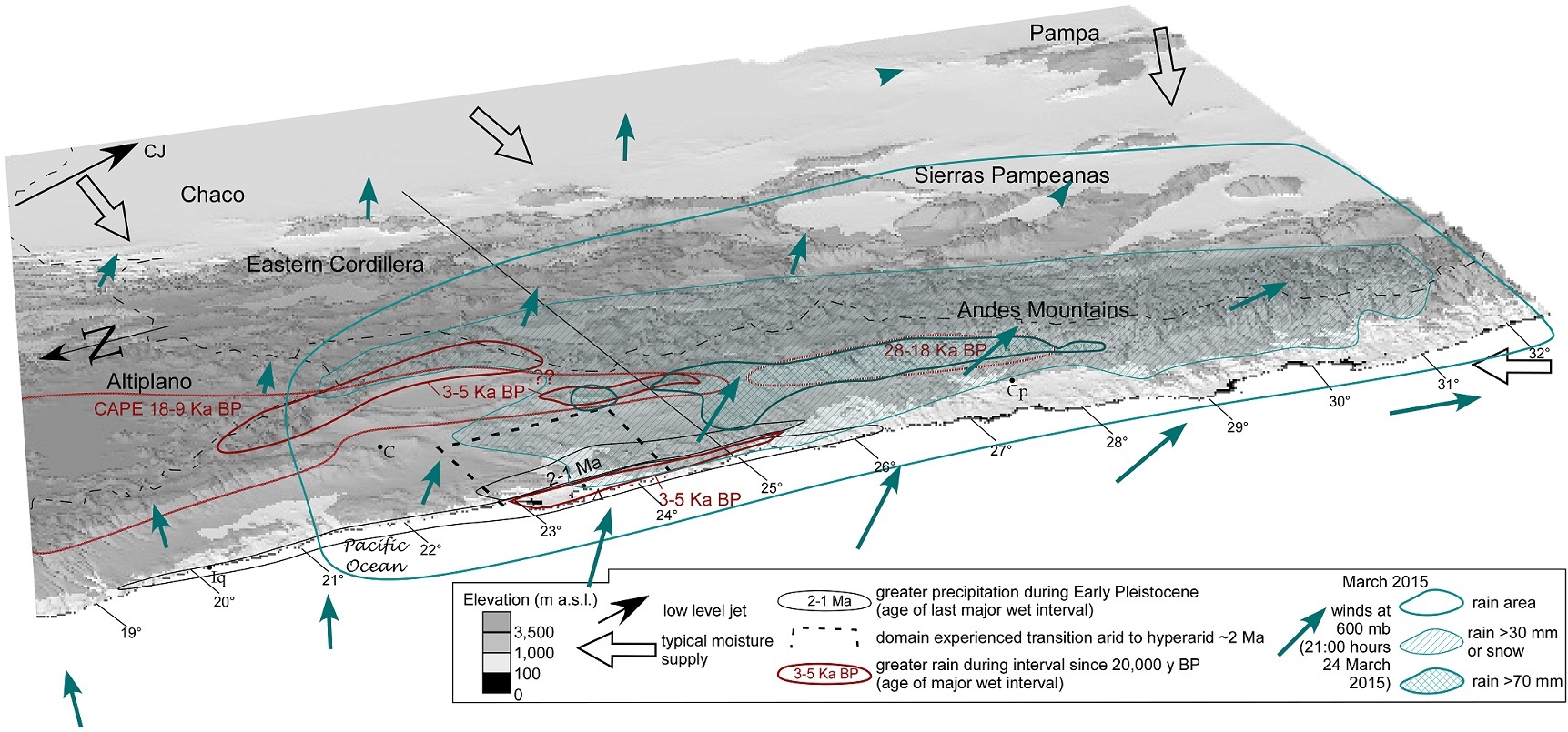 Fig. 8. Paleoclimate domains of the western slope of the Andes and forearc region, on an oblique DEM, and 24-26 March 2015 precipitation event features overlain. Block arrows are modern precipitation transport paths (from Fig. 2). Boundaries are drawn around areas in which proxy evidence for a given time interval of wetter climate during the Quaternary is documented; those boundary positions are not fully documented. The wetter intervals have commonly been attributed to either greater supply of moisture from the east during summers (west-directed block arrows), or greater supply from the south during winters (north-directed block arrow). Overlain is the extent of March 2015 rain as well as the horizontal wind vectors at 600 mb calculated at 9:00 PM local time 24 March 2015 (25 March 2015 0000 UTC). Because the image has been warped to achieve an oblique view, a standard vector length is not fixed but decreases toward the top of the figure. City locations: Iquique (Iq), Antofagasta (A), Calama (C), and Copiapó (Cp). CJ marks the location and direction of the Chaco low level jet. East-west line marks position of profile shown in figure 4.