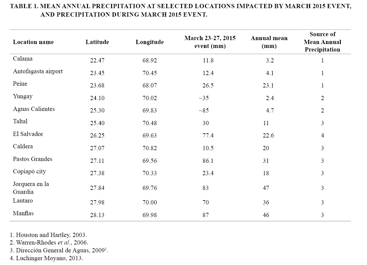 Details about paleoclimate, geomorphology or groundwater hydrology are valuable in answering these questions by providing a longer chronicle of precipitation and its spatial and temporal variability. However, published studies to date have not considered the March 2015 hydrometeorological scenario as a mechanism for late Pleistocene and Holocene wet paleoclimate periods (e.g., Gayó et al., 2012; Sáez et al., 2016). The objectives of this paper are to lay the foundation for reconsideration of existing paleoclimate and groundwater data sets and to show the need for the collection of new data from paleorecords that would enable comparison to the March 2015 precipitation event.