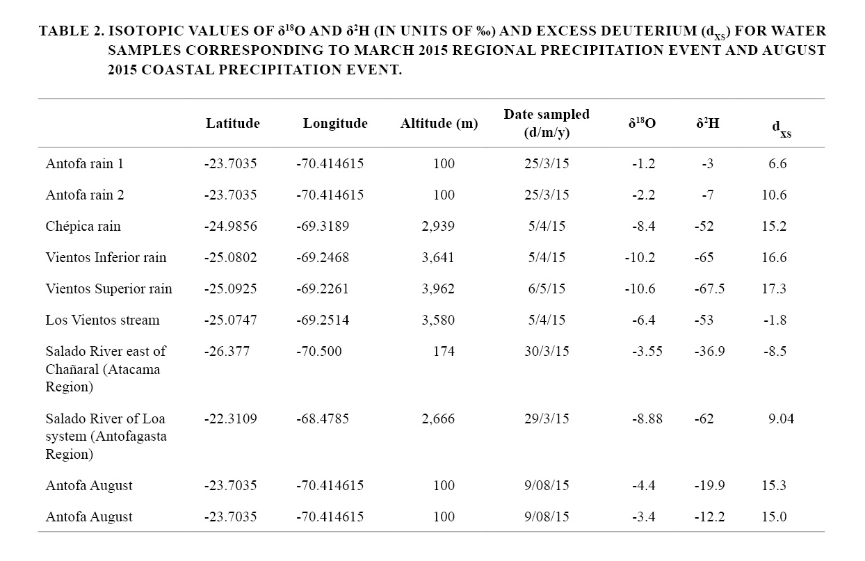 Rain water sampled in Antofagasta city near the coast on August 9, 2015 (Table 2) was isotopically depleted by -2 ‰ for d18O (-3.4 and -4.4‰) and -11‰ for d2H (-12.2 and -19.9‰) compared to the March 2015 rain. The August data indicate a Pacific water vapor source as inferred from atmospheric circulation during the storm, but from a latitude further south which is more typical of rain for northern Chile (Fig. 3). This is in contrast to the low latitude Pacific water vapor source for March 2015 precipitation.