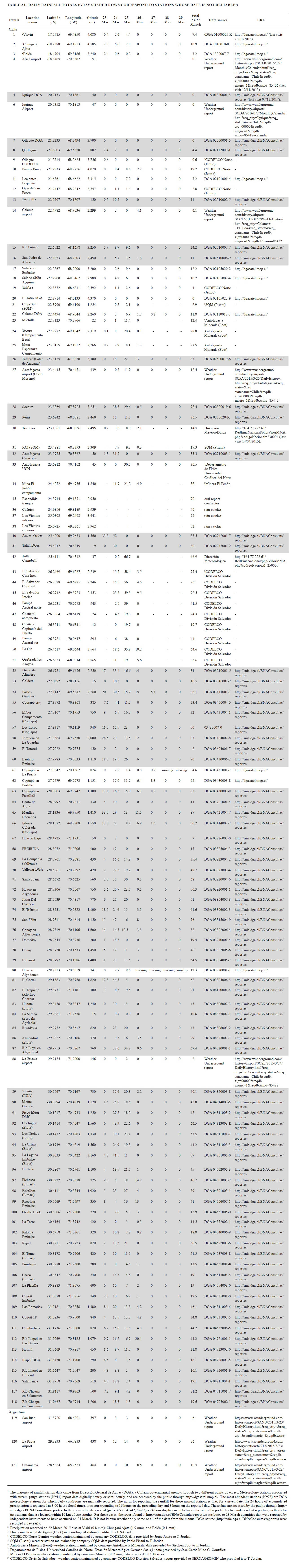 Daily sums of liquid precipitation corresponding to 23-29 March 2015 at 114 stations in Chile and three stations in Argentina between 20°-32° S were compiled (Appendix Table A1) from two Chilean government agencies, five mining companies, a commercial weather forecasting service and university-hosted weather stations. Examination of the data revealed an apparent reporting inconsistency with one public data source that limits the temporal resolution of the full data set (Appendix Table A1 note). Therefore, we report the spatial distribution of amount for a span of days that exceeds the precipitation event. Total precipitation quantities for four other stations are available (Appendix Table A1, items 35-38), three of which were rain catchers described above. The full set of station data were manually contoured (Fig. 2B) as lines of equal precipitation. Because only two of the meteorological stations captured snow (Appendix Table A2) the total precitation is under reported. The spatial coverage of snow on 27 March 2015 was traced from a MODIS satellite image (https://earthdata.nasa.gov/labs/worldview/ (last visit 16/06/2015)).