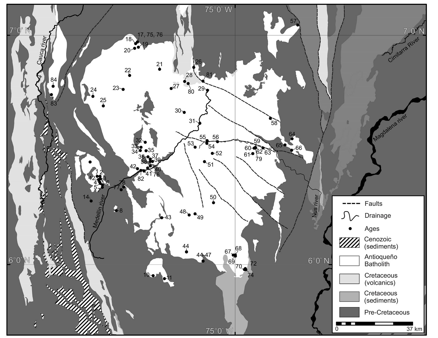 However, geochemical and geochronological data from this batholith are limited to scarce international works presenting extensive formation ages and discussing the origin of the Antioquia Batholith in a long term tectonic model including both the transition from Nazca-dominated to Caribbean-dominated tectonics.