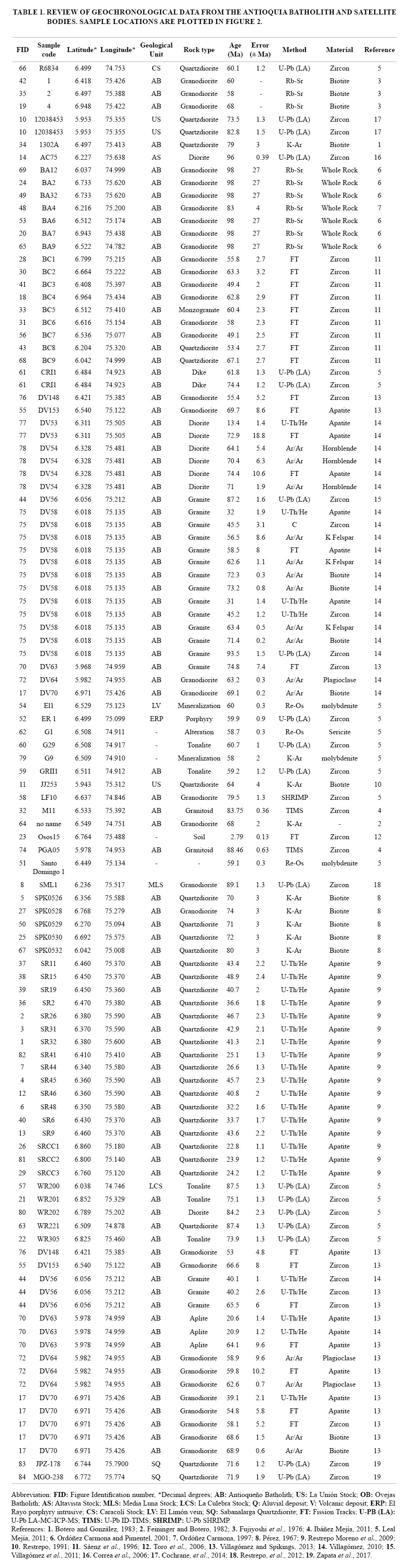 Along decades, different geochronometers as U-Pb, 40Ar/39Ar, K-Ar, U-Th/He, Fission tracks, Re/Os and Rb/Sr have been used on the Antioquia Batholith, obtaining a considerable dataset. A review of all available geochronological ages are listed in table 1, where basic data are gathered including sampling site, method, material, error, among others.
