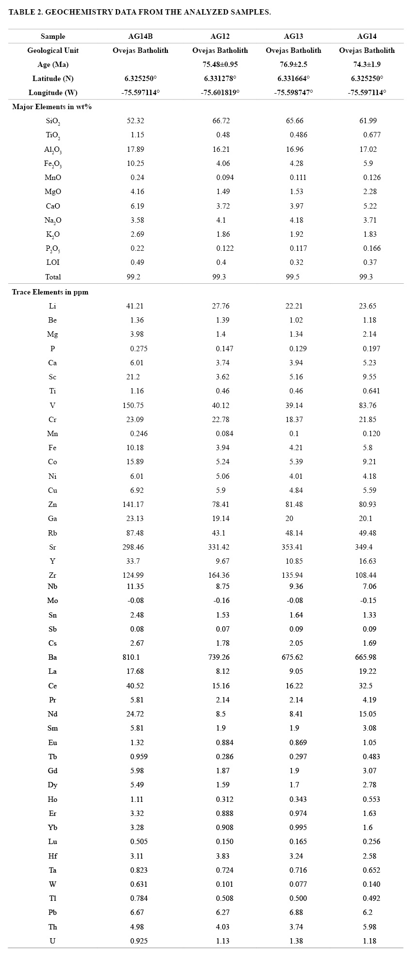 Four samples of the Ovejas Batholith were geochemically analyzed and their results are presented in table 2. Three samples correspond to the main granodioritic mass of the Ovejas Batholith and one sample from a mafic enclave. Samples belonging to the granodioritic mass were classified as quartz-diorites and diorites, meanwhile the mafic enclave fall in the gabbro field (Fig. 4A). SiO2 vary from 61.9 to 66.7 wt%, while K2O content is almost invariant around ~1.8 wt% for the granitic samples, which fall in the calc-alkaline series of medium K (Fig. 4B). The mafic enclave has 52.3% of Si2O and higher K2O, locating the sample on the Shoshonitic series. MgO values range from 1.5 to 2.3 wt% in the granitic samples, and have a value of 4.1 wt% for the mafic enclave. Al2O3 values range from 16.2 to 17.0 wt% within the granitic samples, and 17.9 wt% for the mafic enclave. From the four analyzed samples, two samples, (the mafic enclave and one granitic sample) fall in the metaluminous field, meanwhile the other two granitic rocks fall into the peraluminous field (Fig. 4C).