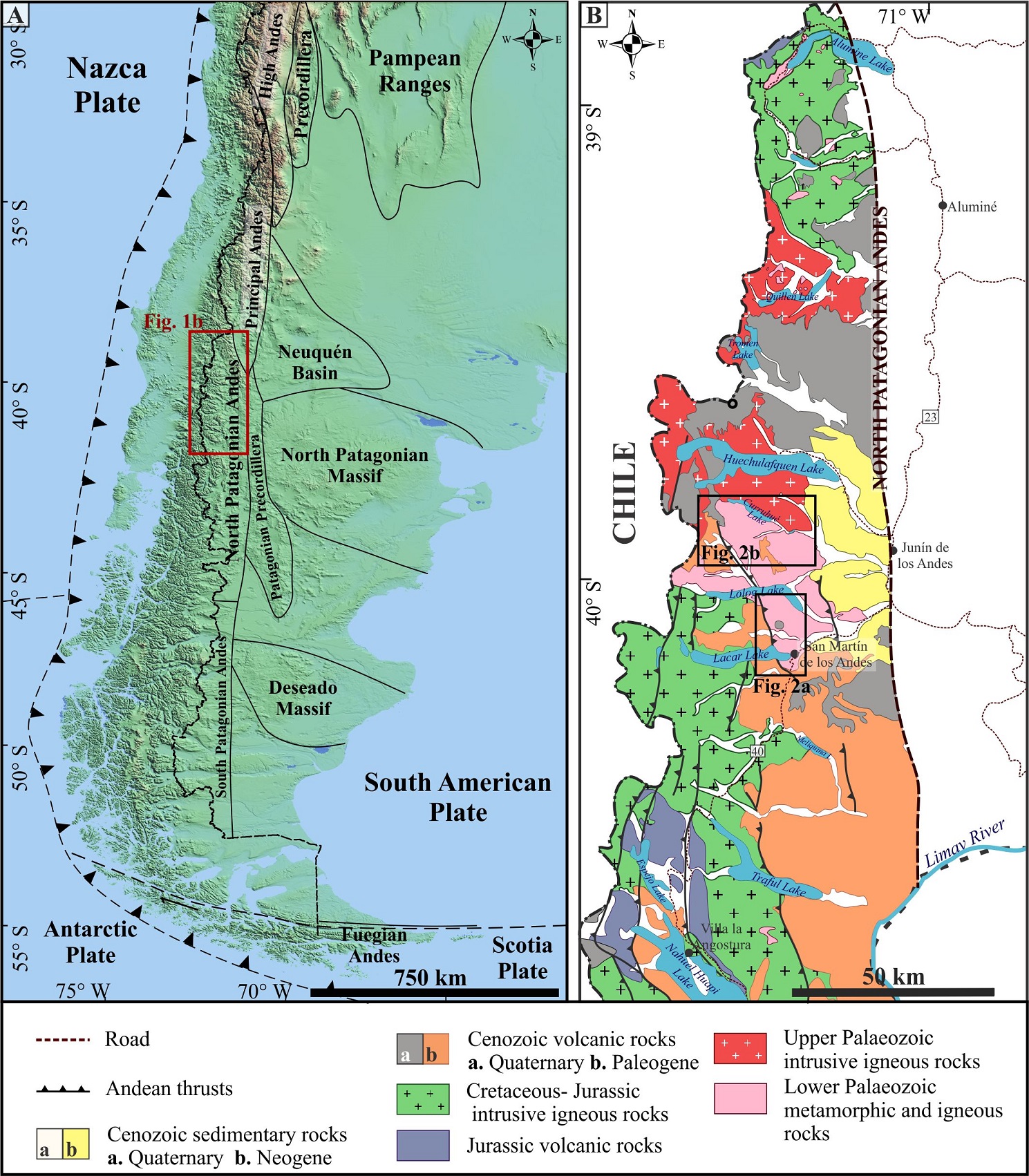 The study area is located in Neuquén Province (Argentina), between the Lácar and Curruhué lakes, in the surroundings of the San Martín de los Andes locality (Fig. 1). The studied rocks belong to the Patagonian Sector of the Argentinean-Chilean Andes basement (Heredia et al., 2016, 2018), mainly constituted by metamorphic and igneous rocks (Fig. 1b).