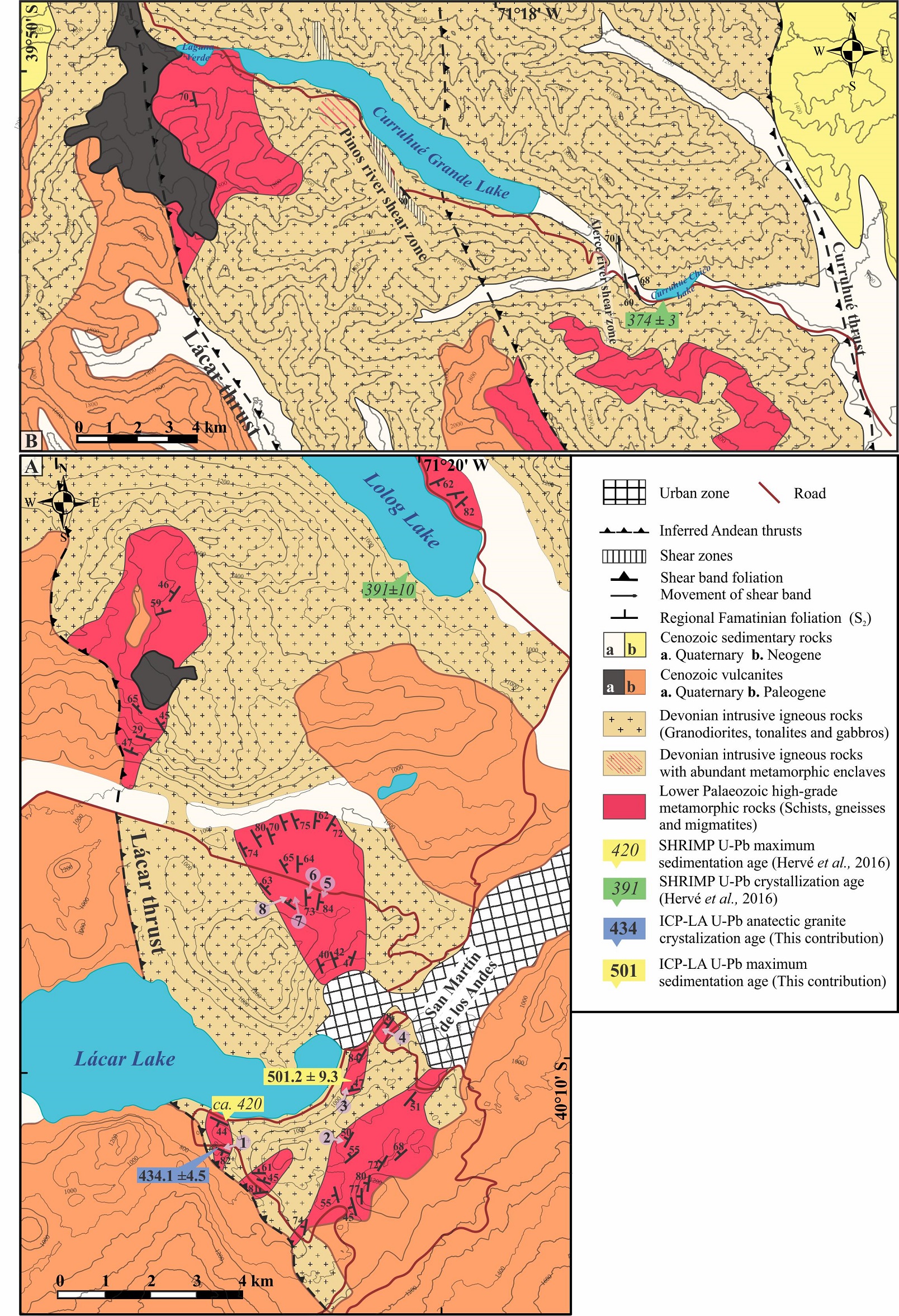 The age of these high-grade metamorphic rocks has been matter of discussion in recent years. A Neoproterozoic age was proposed by Dalla Salda et al. (1991), based on Rb-Sr ages of ca. 860 Ma. However, more recent studies constrained the maximum deposition age of the protolith in this area in ca. 420 Ma (Hervé et al., 2016). Additionally, Serra-Varela et al. (2016) proposed for the same protolith a maximum sedimentation age of ca. 506 Ma based on U-Pb Q-ICP-MS-LA detrital zircons analysis. This discrepancy between this age data will be discussed later in this contribution. Crystallization ages for the San Martín de los Andes Tonalite and the Lago Lácar Granodiorite have been constrained by U-Pb zircon analysis at ca. 400 Ma (Hervé et al., 2016, 2013; Pankhurst et al., 2006; Varela et al., 2005).