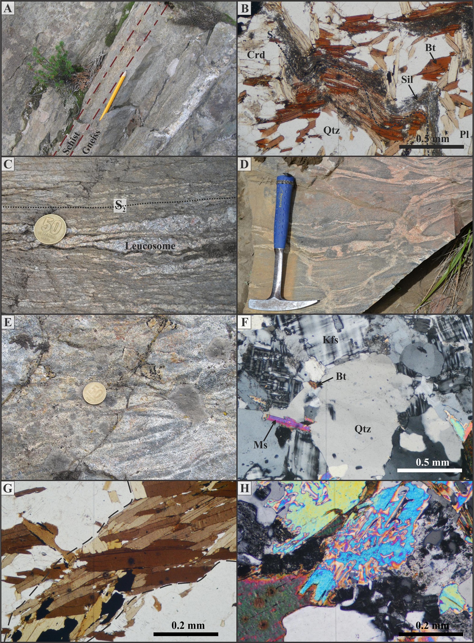 The metasedimentary rocks are predominantly gneisses with minor schists (Fig. 3A). We distinguish one main metamorphic assemblage in schists (Fig. 3B): Qtz+Pl+Bt+Crd+Sil (fibrolite) ±Ms±Kfs±Gr (Mineral abreviations according to Siivola and Schmid, 2007) and one main metamorphic assemblage in gneisses: Qtz+Pl+Bt+Ms+Crd±Sil (fibrolite)±Kfs.