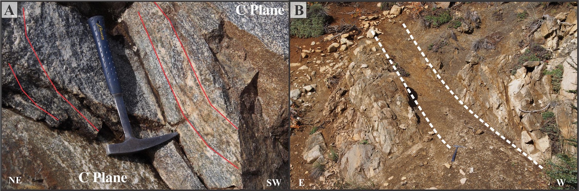 Fig. 5. A. Detail of the río Alerce shear band, showing C and S structures in red; B. Andean brittle fault.