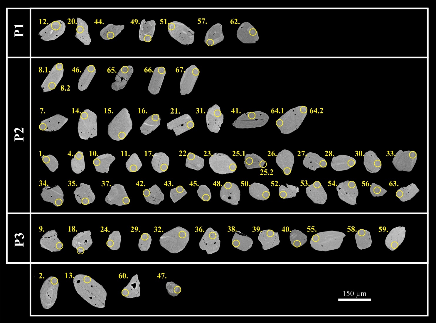 Fig. 7. Backscattered images of the detrital zircons analyzed by LA-Q-ICP-MS of the metasedimentary rock from Serra-Varela et al. (2016). Spot number is shown for each grain. Based on age distributions different populations were identified: P1 population (656 to 496 Ma); P2 population (1,264 to 874 Ma); and P3 population (1,510 to 1,299 Ma). Single grains display ages of 1,891, 2,056, 2,127 and 2,556 Ma. Spot size of 30 µm.