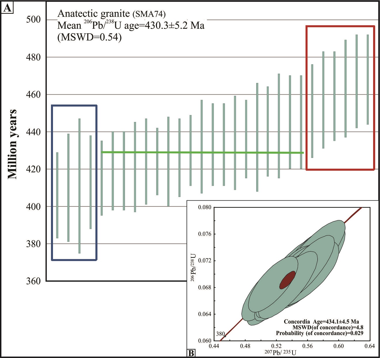 Thirty analyses were carried out in thirty different zircons. Twenty-nine concordant ages were obtained. Zircons can be divided into 3 groups based on their ages (Fig. 10A). The main group is composed of nineteen analyses and we considered that it defines the crystallization age of the granite. This cluster yielded a mean age of 430.3±5.2 (MSWD=0.54) and defines a Concordia age of=434.1±4.5 Ma (MSWD=4.8). Another group is composed by six zircons whose mean age is 461±10 Ma. (MSWD=0.27). These zircons show inherited cores that were partly included in the analyzed spot giving an aged mixed-age. The remaining four zircons gave a mean age of 416.4±9.7 Ma (MSWD=0.37) (Fig. 10A and B). This could be a younger age caused by rejuvenation due to the Lower Devonian granitoids emplacement.