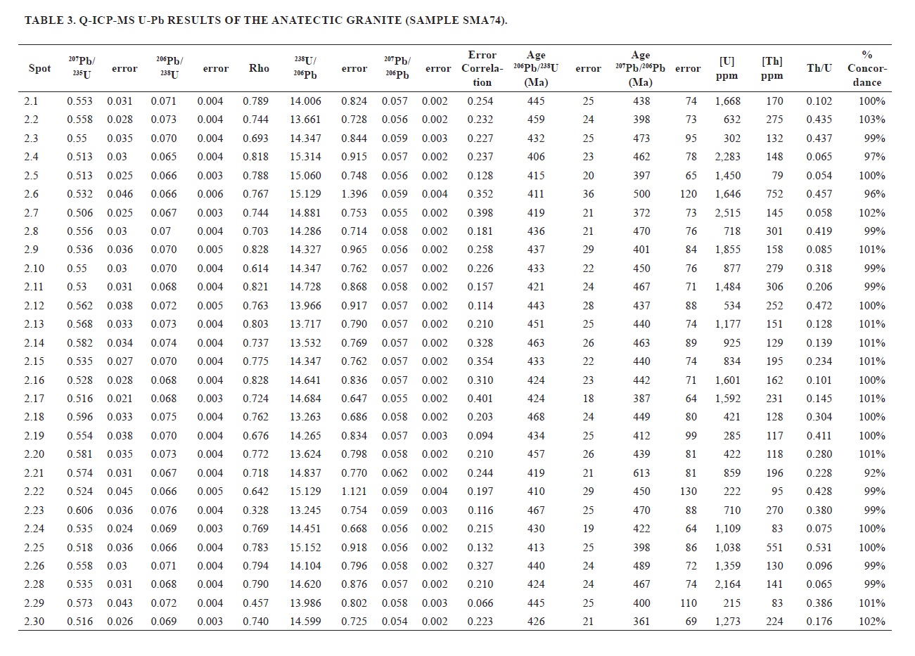 The dated anatectic granite has the same field relations and similar geochemical features as the leucosomes of diatexite migmatites. For this reason, the U-Pb zircon crystallization age obtained for this anatectic granite can be considered as the age of the main migmatization event. The emplacement of the anatectic granite took place during Llandovery-Wenlock, at approximately 430-434 Ma. This age is a good constraint for the metamorphic peak and for the end of the regional (D2) deformation event (Fig. 11).