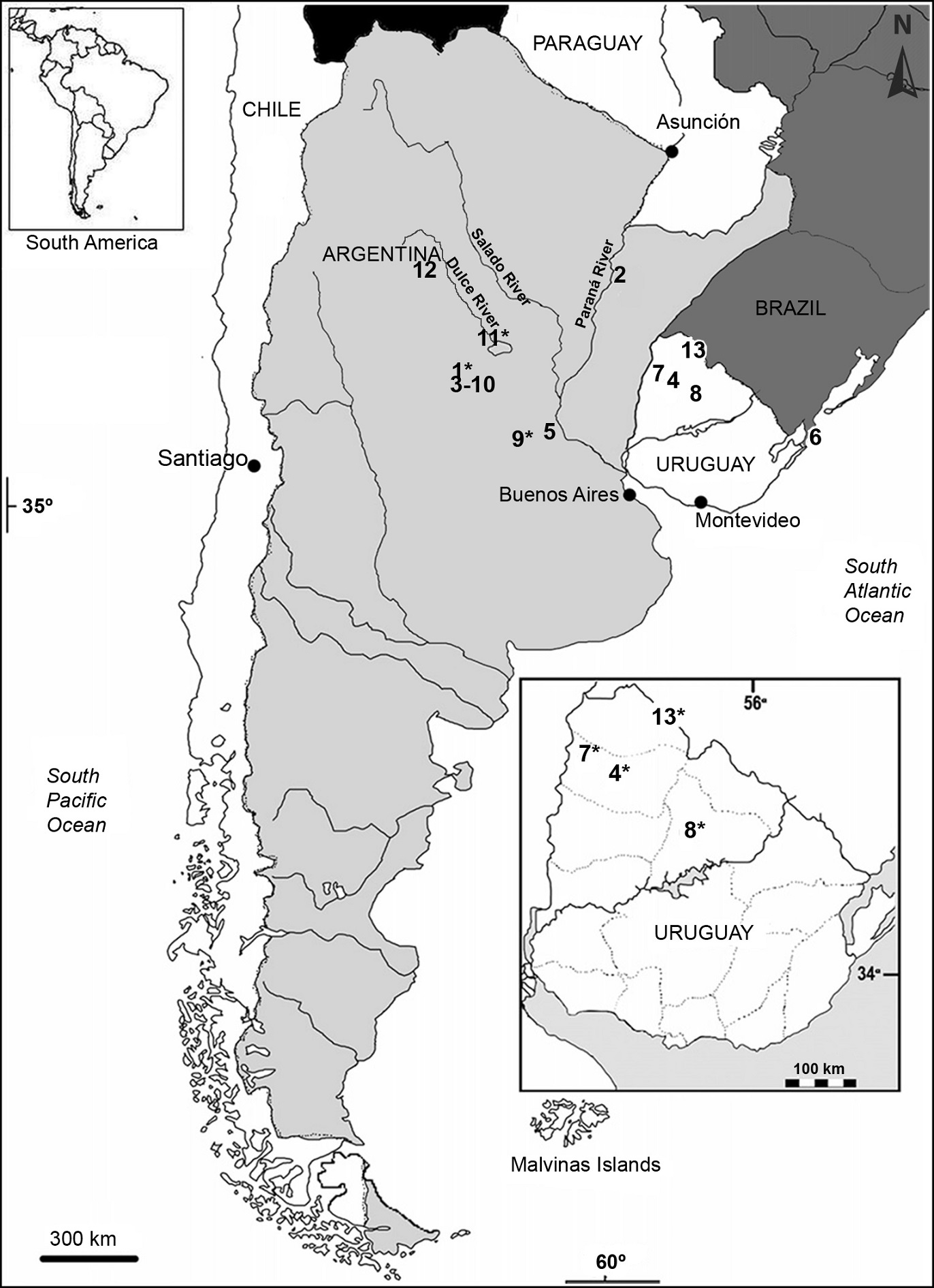 The studied remains correspond to seven adult specimens, all of them with accurate stratigraphic origin and housed at institutional collections of Uruguay and Argentina: Colección Paleontológica de Vertebrados de la Facultad de Ciencias (FC-DPV); Museo de Arqueología y Ciencias Naturales de Salto (MACN-S); Museo Histórico Departamental de Artigas (MHD-P); Museo La Plata (MLP); Museo Argentino de Ciencias Naturales “Bernardino Rivadavia” (MACN-PV) and Museo de Ciencias Naturales de la Región de Ansenuza “Aníbal Montes”, Miramar (MAMM-PV).