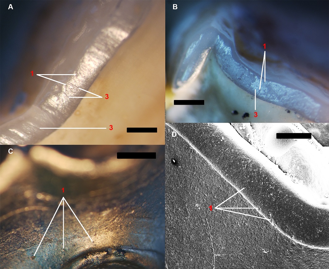 Fig. 4. Tooth surface showing microwear scars. A-B. MHD-P 509 30X; C. FC-DPV 749 30X; D. MACN-S 92 35X. Scale bar 500 micrometers. 1: pits; 3: scratches.