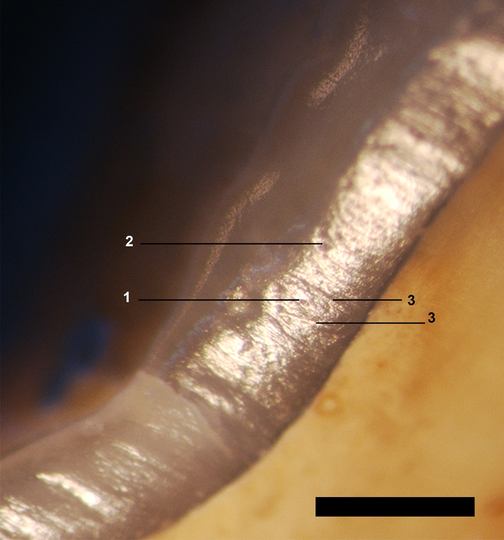 Fig. 5. Detail of microwear of the specimen MHD-P 509 where pits (1), large pits (2) and fine scratches (3) are shown. Scale bar 500 micrometers.