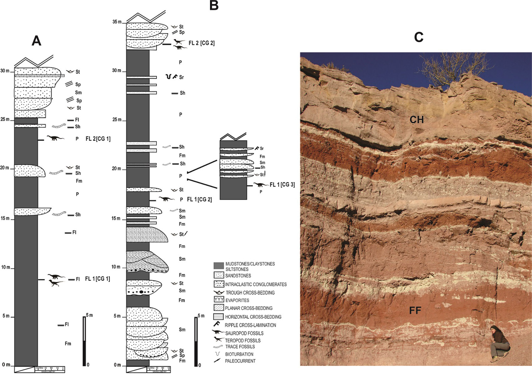 In the associated specimens, the taphonomic signatures are more constant suggesting a similar taphonomic history. The sauropod remains were preserved in the sandy mudstones in well-drained floodplains with different degree of paleosols development, from a lesser level of develop as seen in CG1 site, until higher levels as observed in CG2 and CG3 sites. Well-drained bearing floodplains fossils were sites of intense bioturbation and pedogenesis in which organic debris were readily oxidized (Bridge, 2006). This type of environment was optimal for the preservation of organic remains (e.g., root traces, burrows and articulated/disarticulated bones) in the study area.