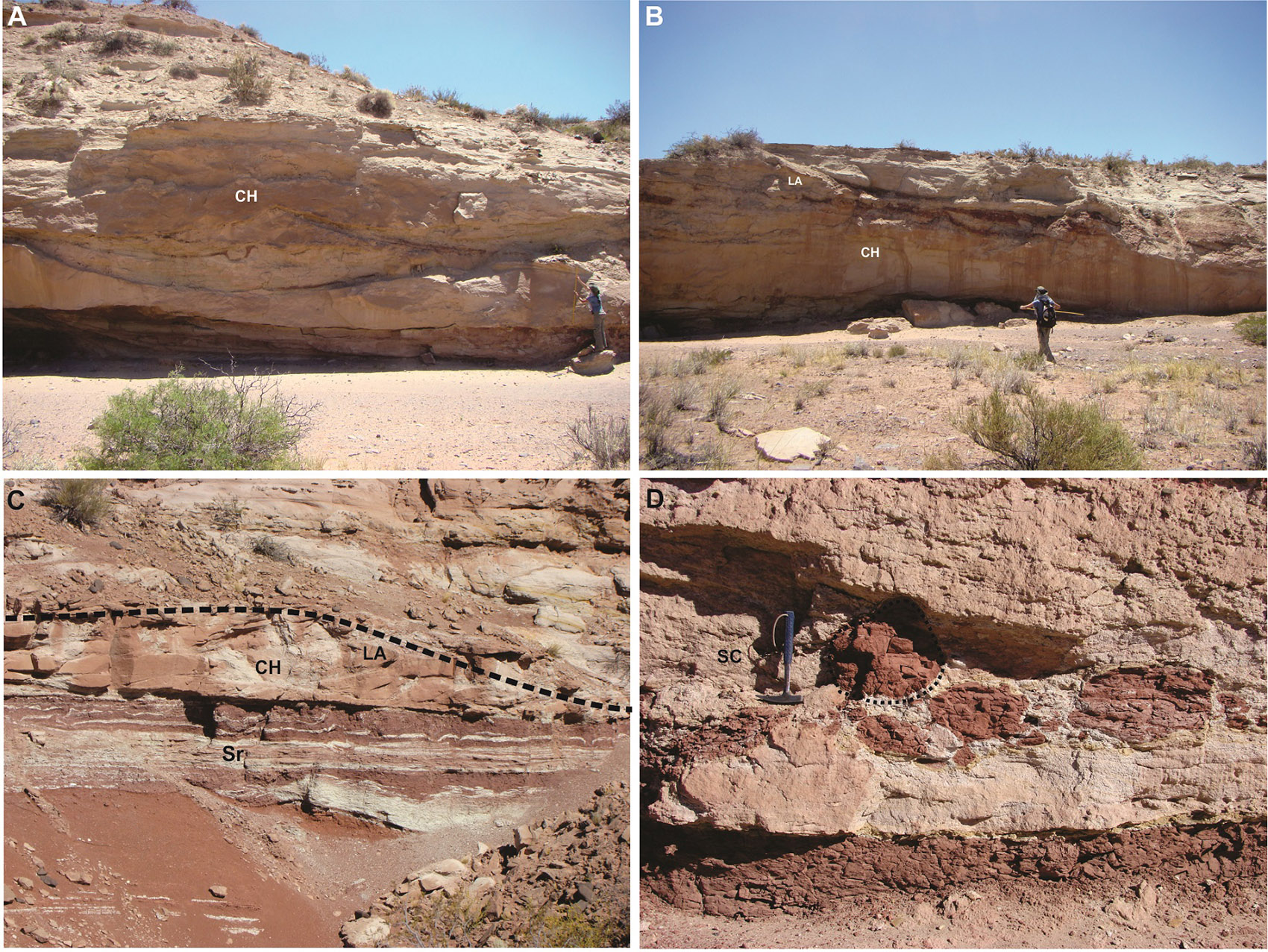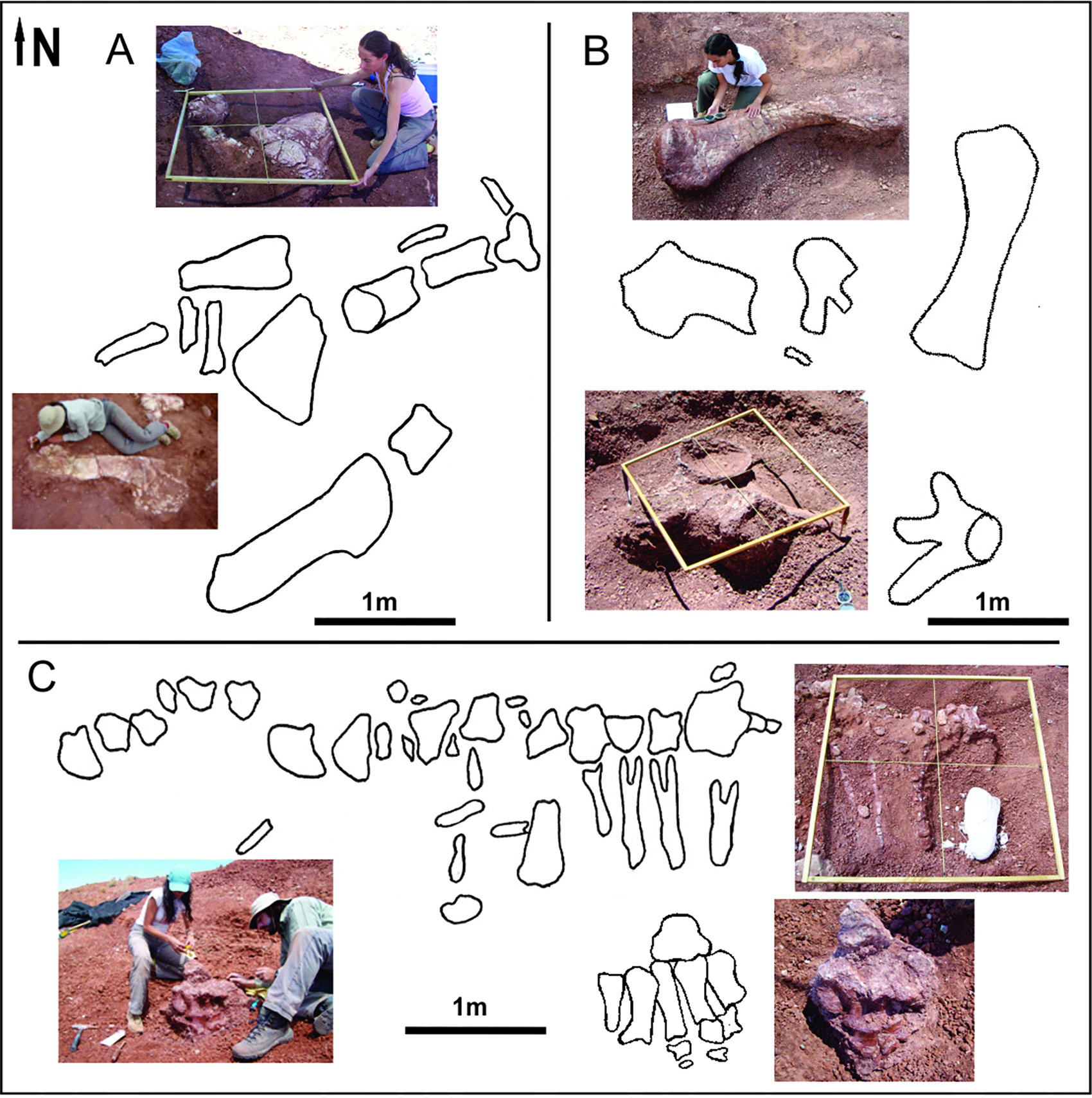 Incomplete skeletons usually include associated remains of the axial and appendicular skeleton, ranging from 2 to 3 disarticulated bones to accumulations of partly articulated remains from various body parts (e.g., Smith et al., 2002; Van Itterbeeck et al., 2004; González Riga et al., 2007; Csiki et al., 2010; Smith et al., 2015). This taphonomic mode is registered in the fossil level (FL1) in both CG2 and CG3 sites and comprises two associated partial skeletons assigned to Notocolossus gonzalezparejasi. The dinosaur remains also were preserved in the sandy mudstones deposited on the floodplain facies, but in this case, the lithofacies show a well-developed paleosols. In the dinosaur-bearing lithofacies, the processes of bioturbation and pedogenesis were very intense and contributed to the oxidation of sediments and recycling of organic matter. The carbonates and other minerals available in this depositional environment caused the rapid permineralization and partially articulated preservation of the specimens.